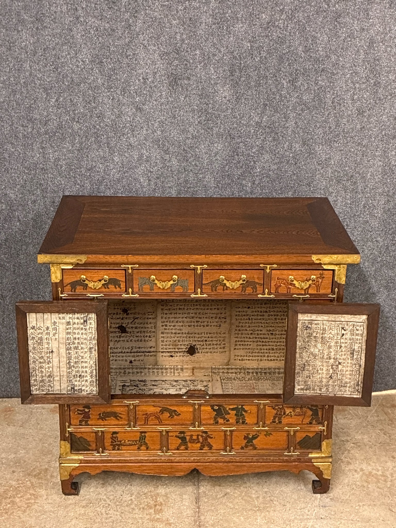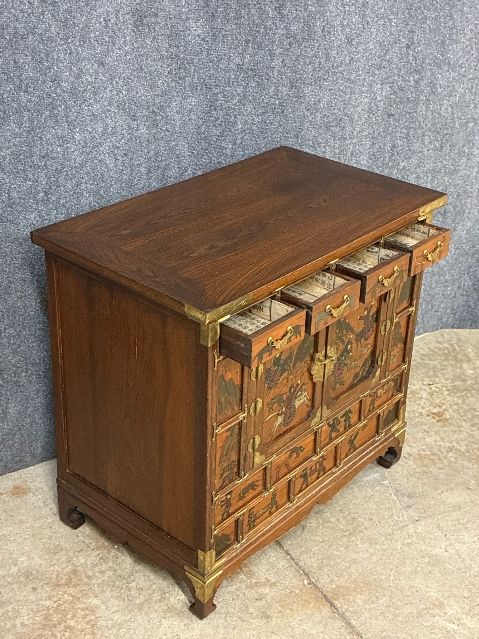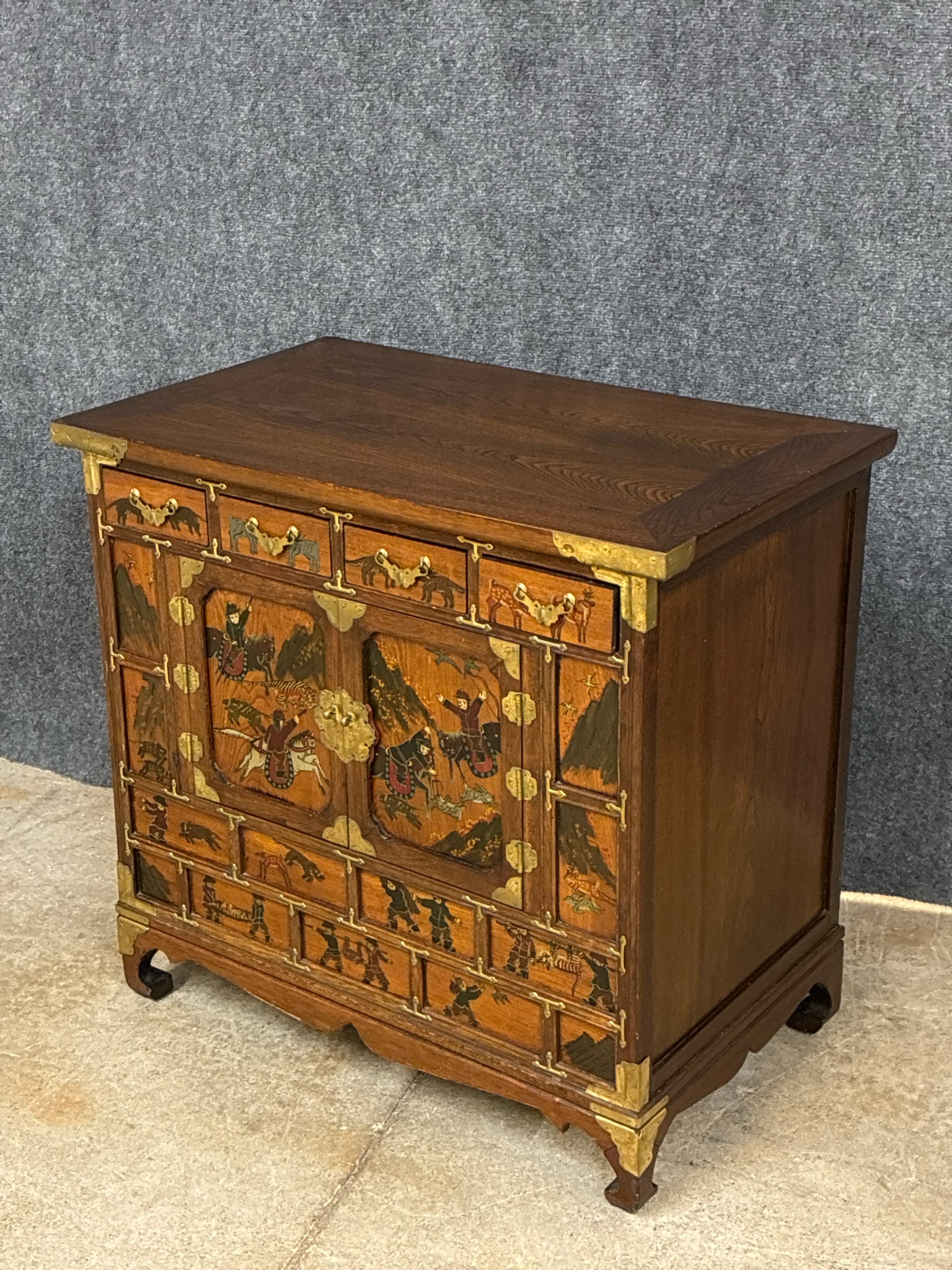 Antique Asian Painted Chest with Brass Accents. Dimensions: 30"W 18"D 28"H