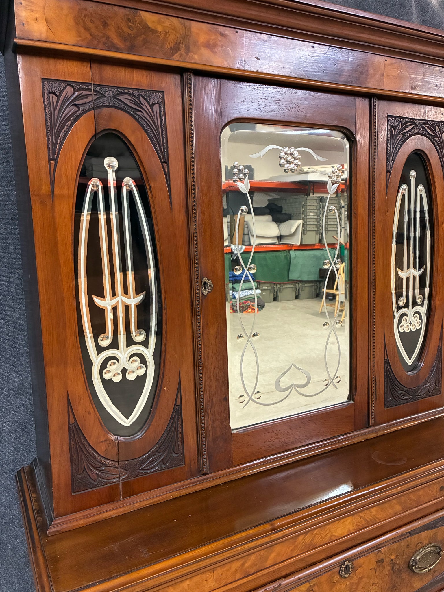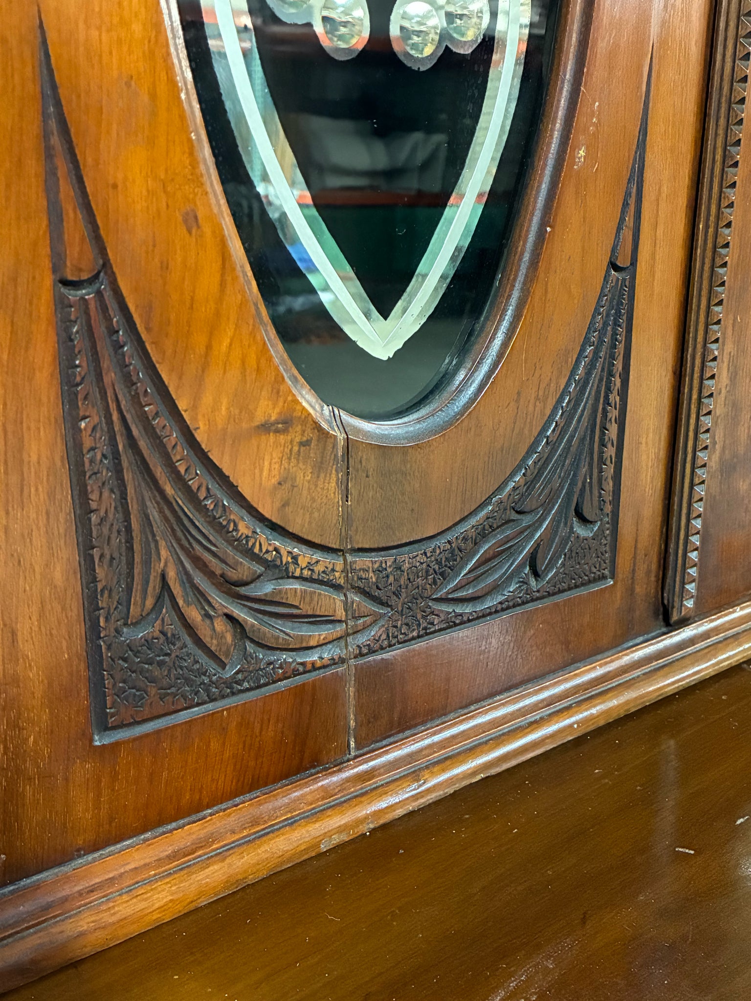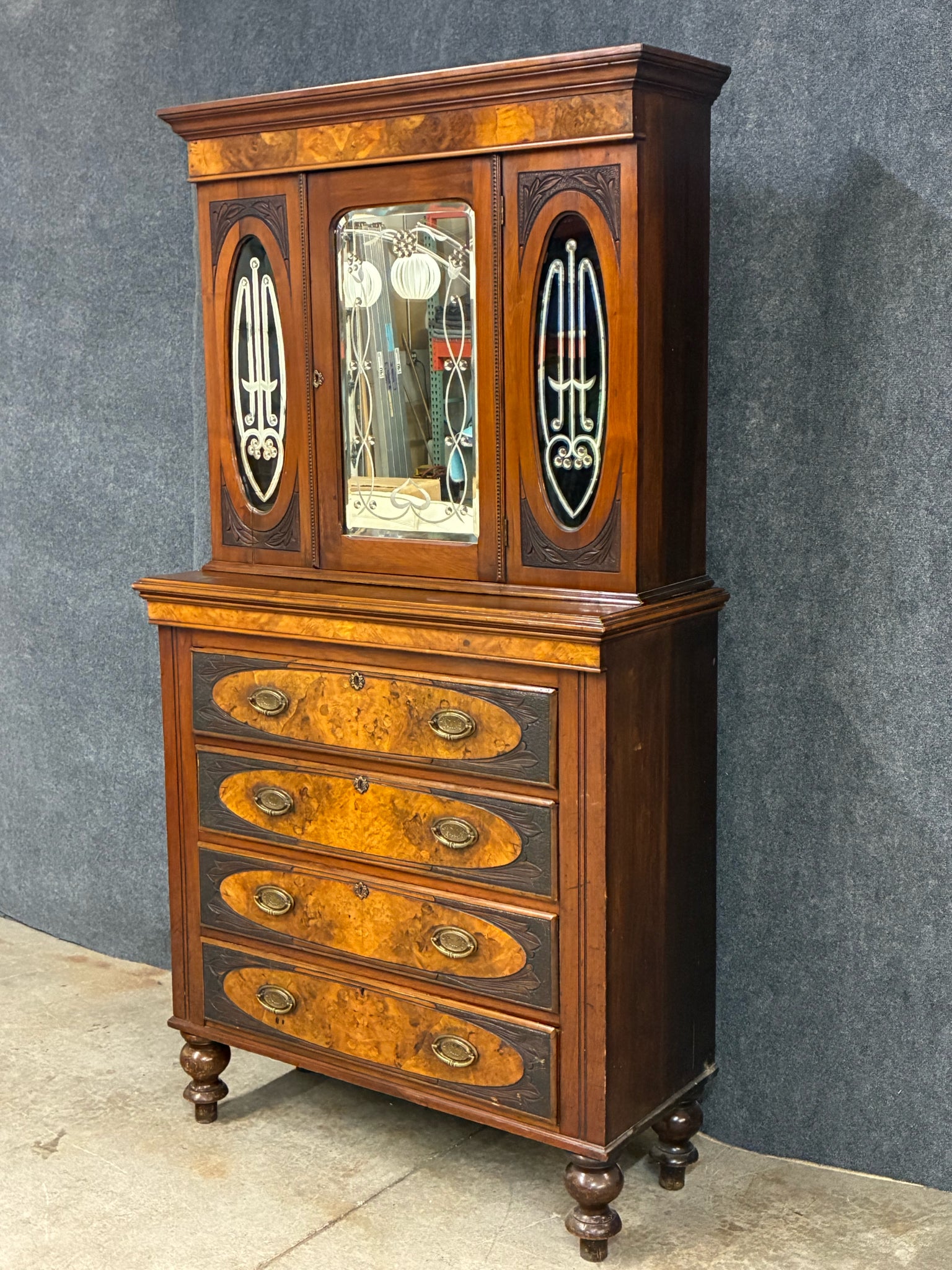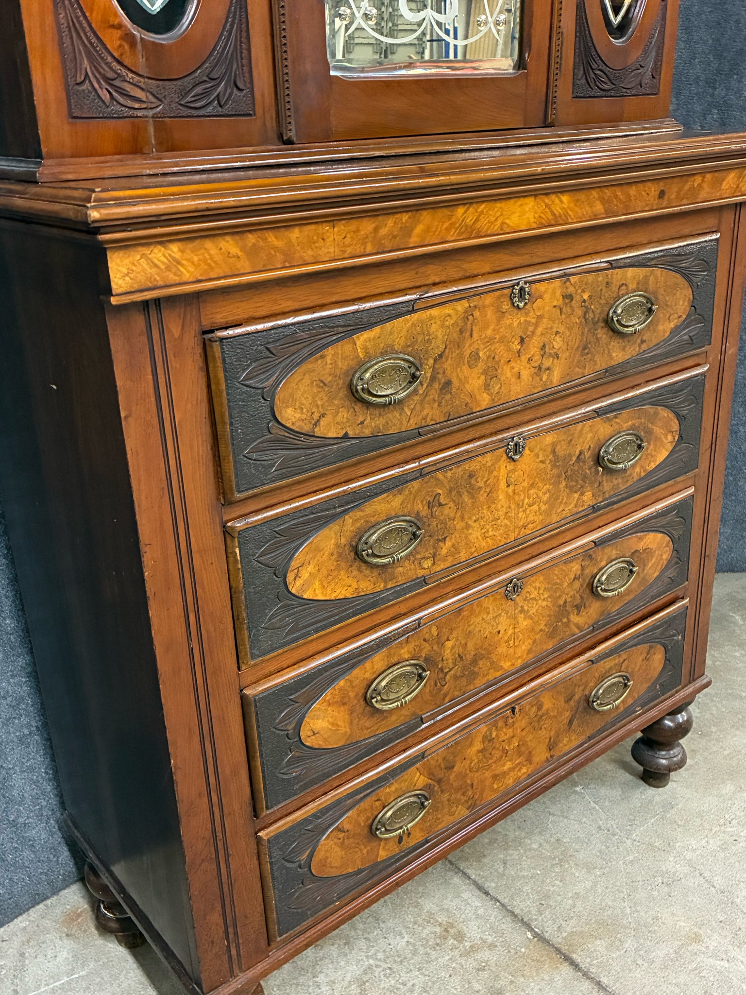 Antique Carved Walnut Secretary Chest With Leaded Mirror Panels