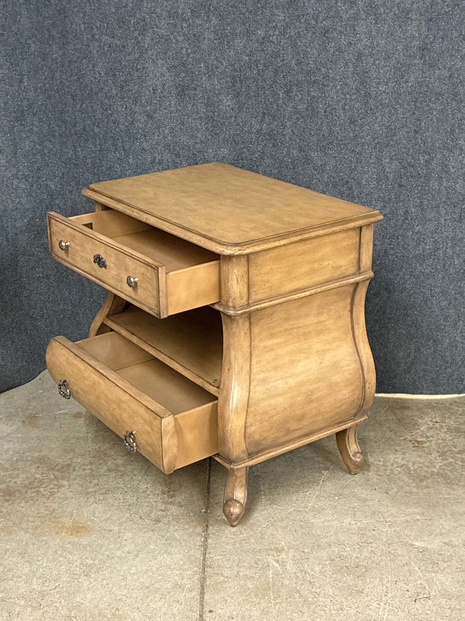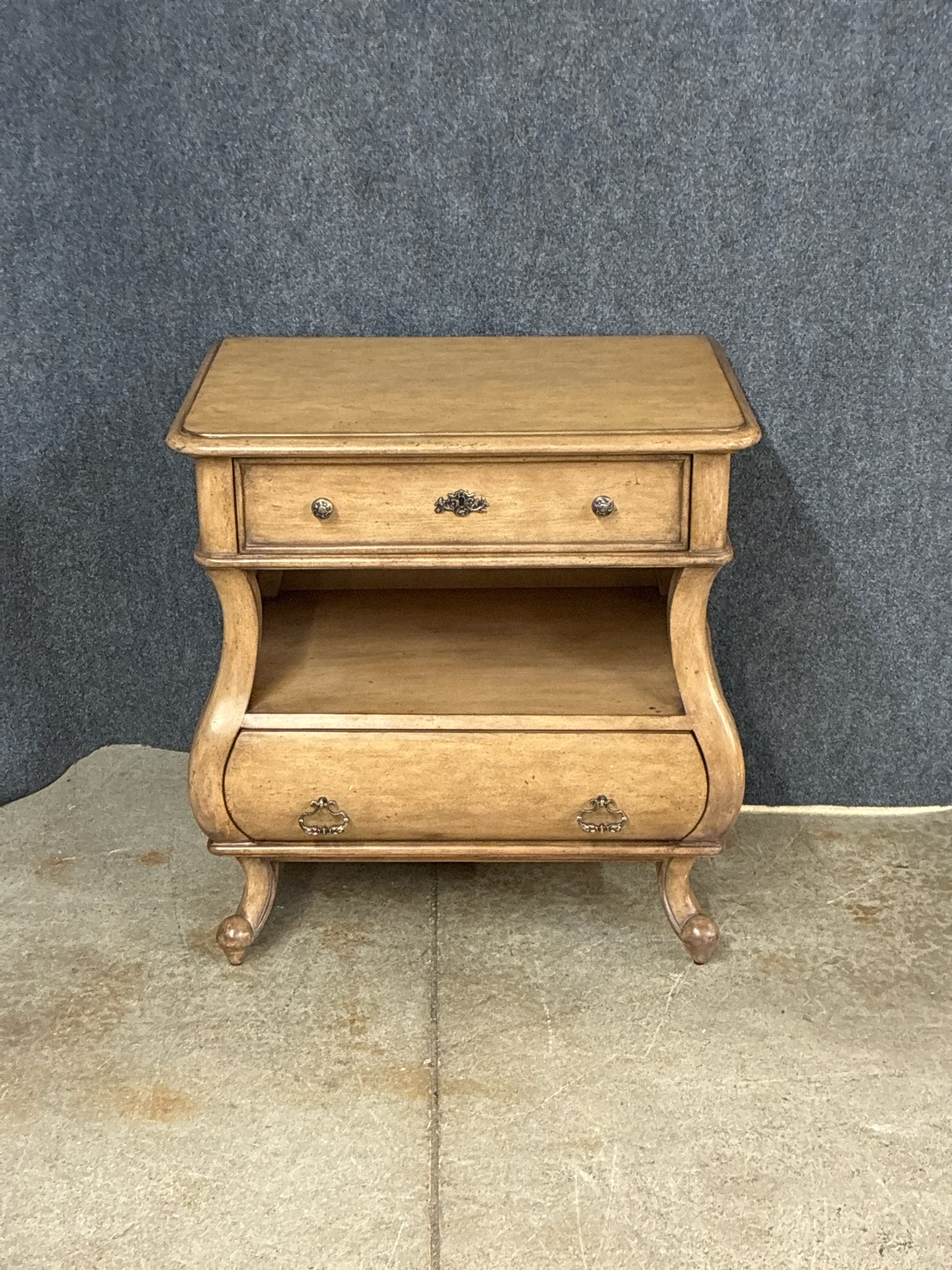 French Heritage Bombe-Style Nightstand/Side Chest. Dimensions: 30" Width, 20" Depth, 32" Height