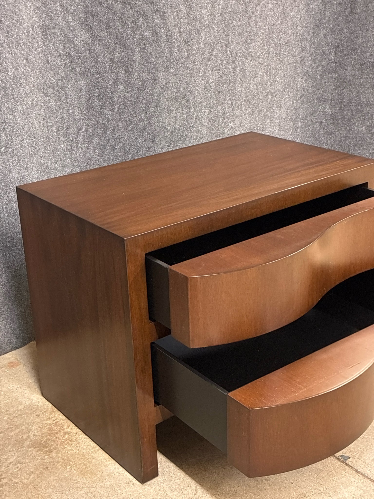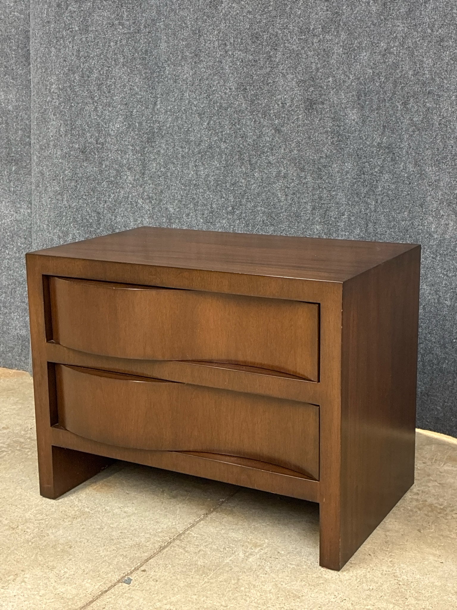 Mid-Century Modern Style 2-Drawer Nightstand With Wave-front Drawers. Dimensions: 34"W 21"D 26"H