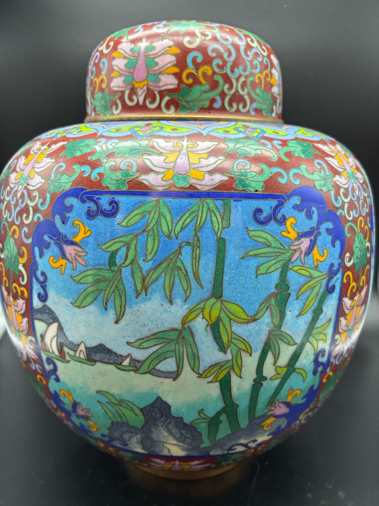 Chinese cloisonne jar with lid, approx 9" H, four panel scenes