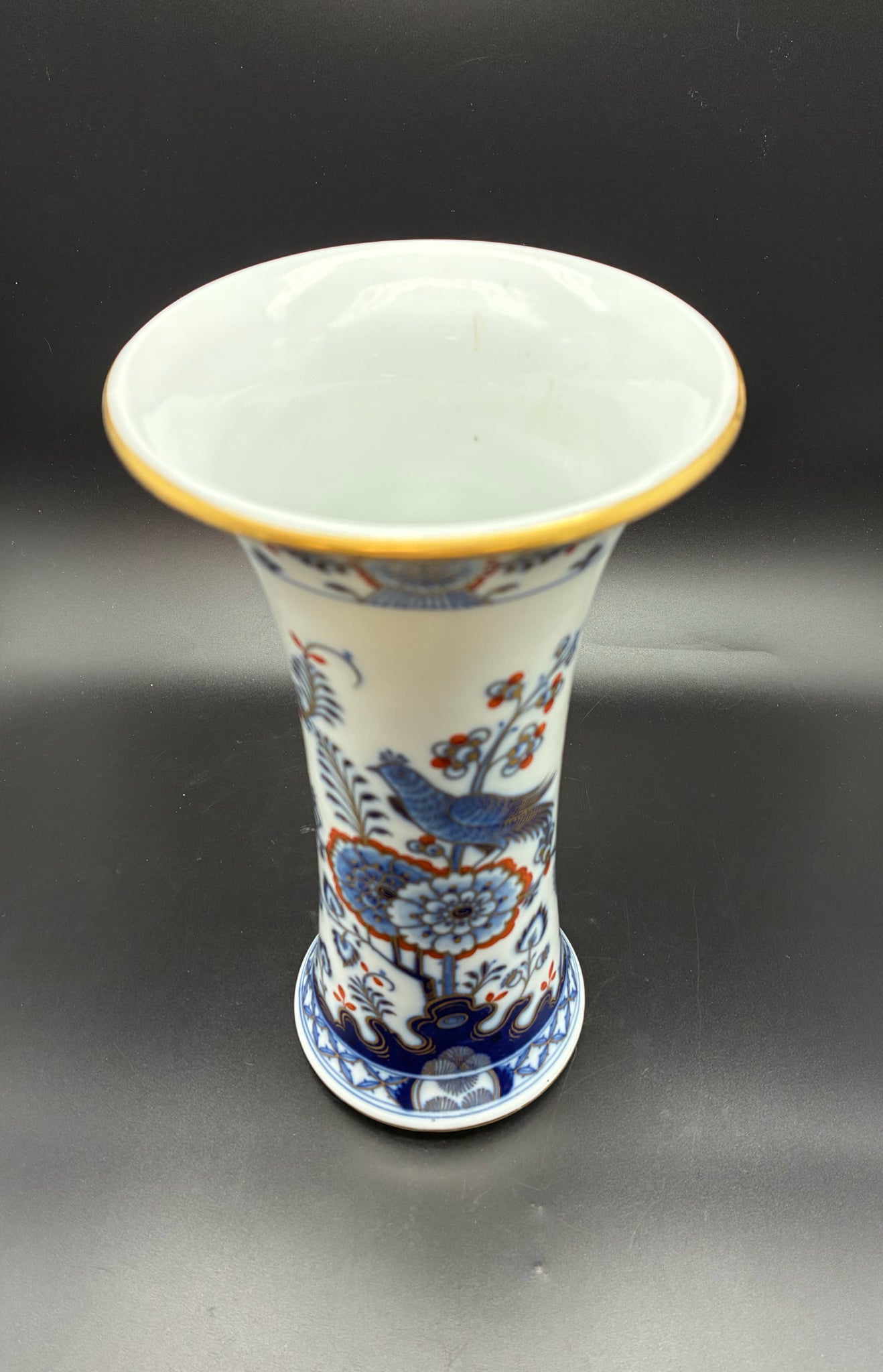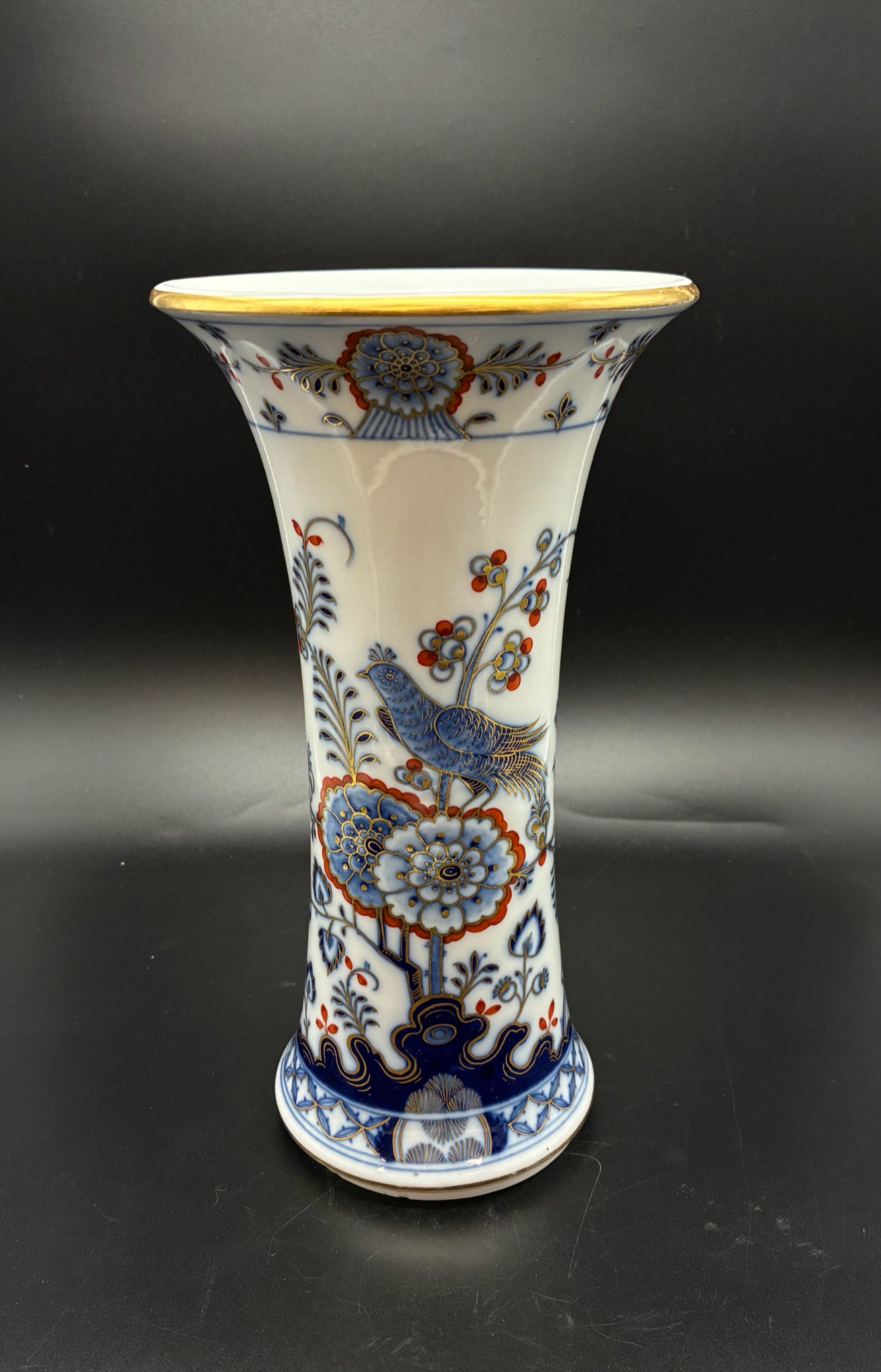 Meissen 9" trumpet vase with blue quail & flowers