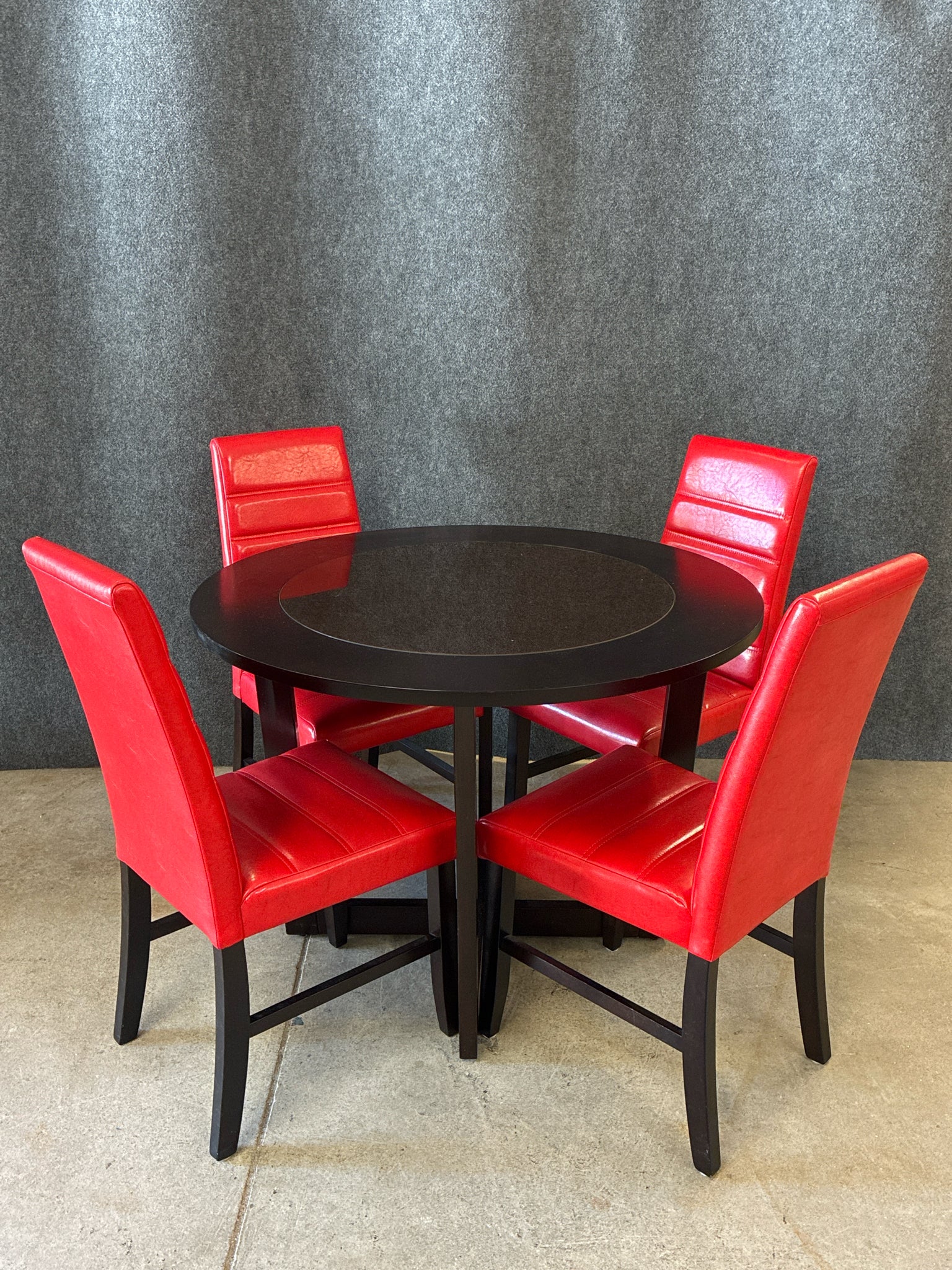 Contemporary 5-Piece Dining Set With Red Chairs, Glass Top. Dimensions: 42"D 30"H