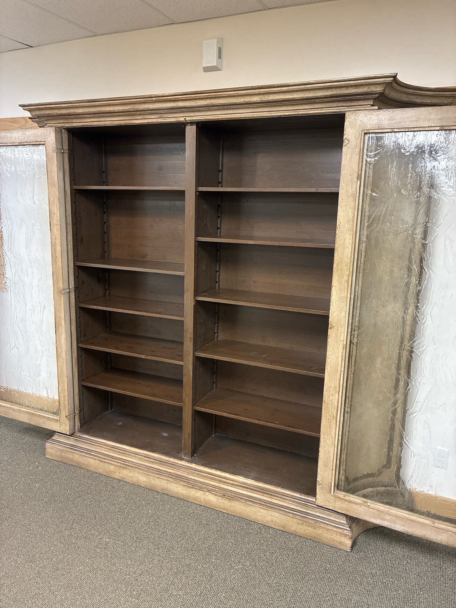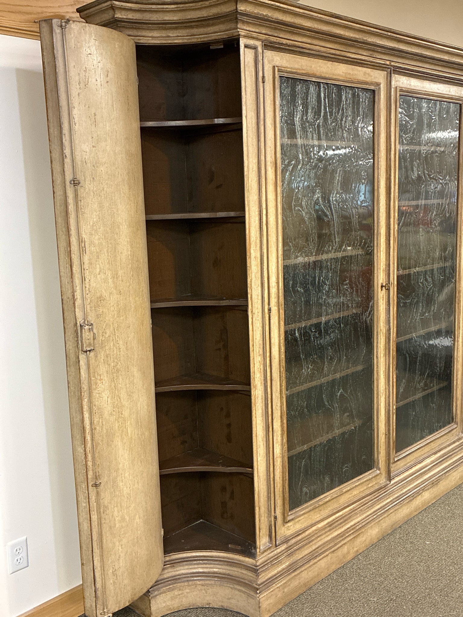 Custom-Built Extra-Large Display Cabinet / Bookcase with a Distressed Painted Finish, Crown Molding, Wavy Glass Locking Double Doors, and Hidden Side Compartments With Shelving. Dimensions: 105"W 20"D 93"H