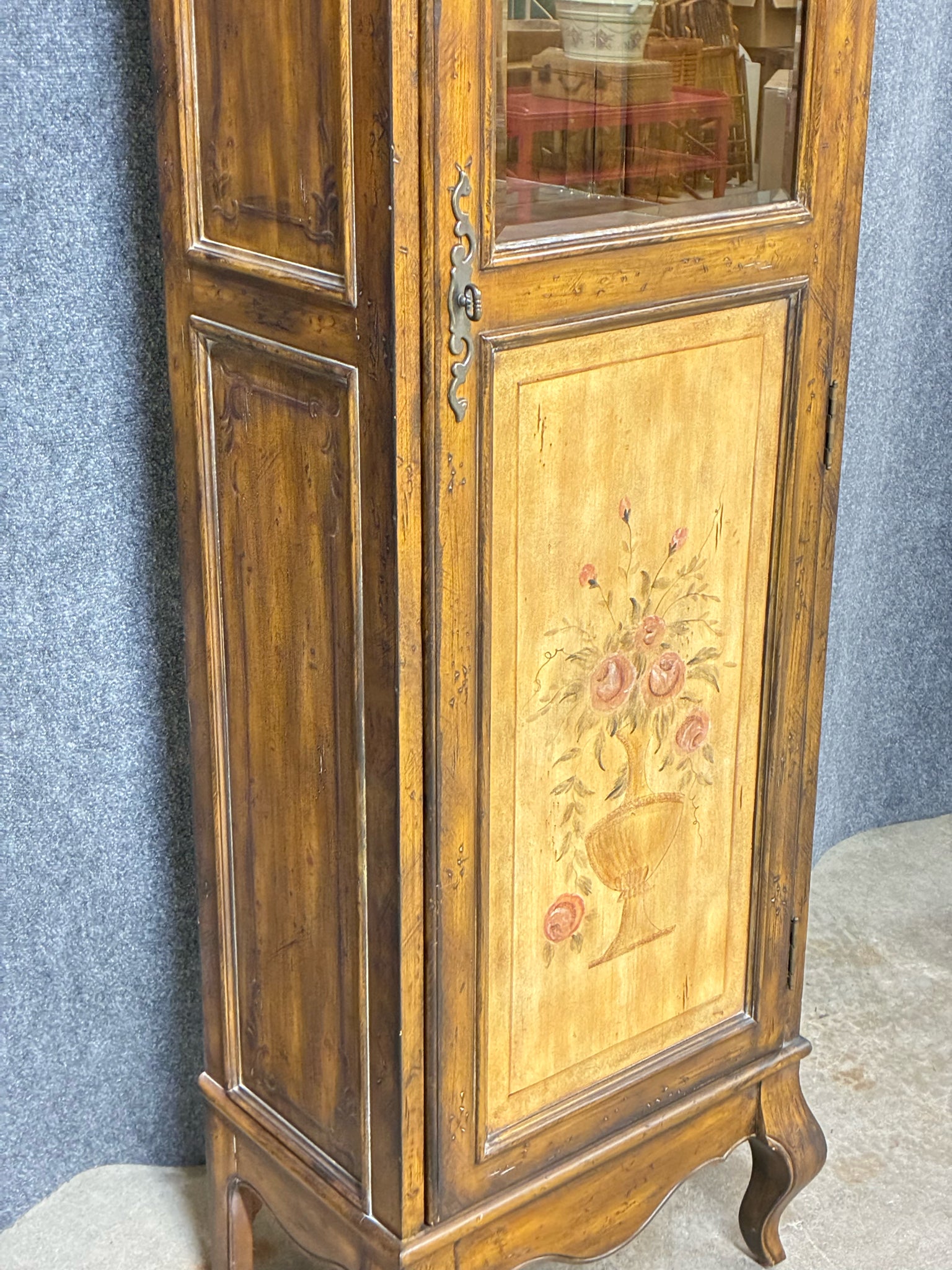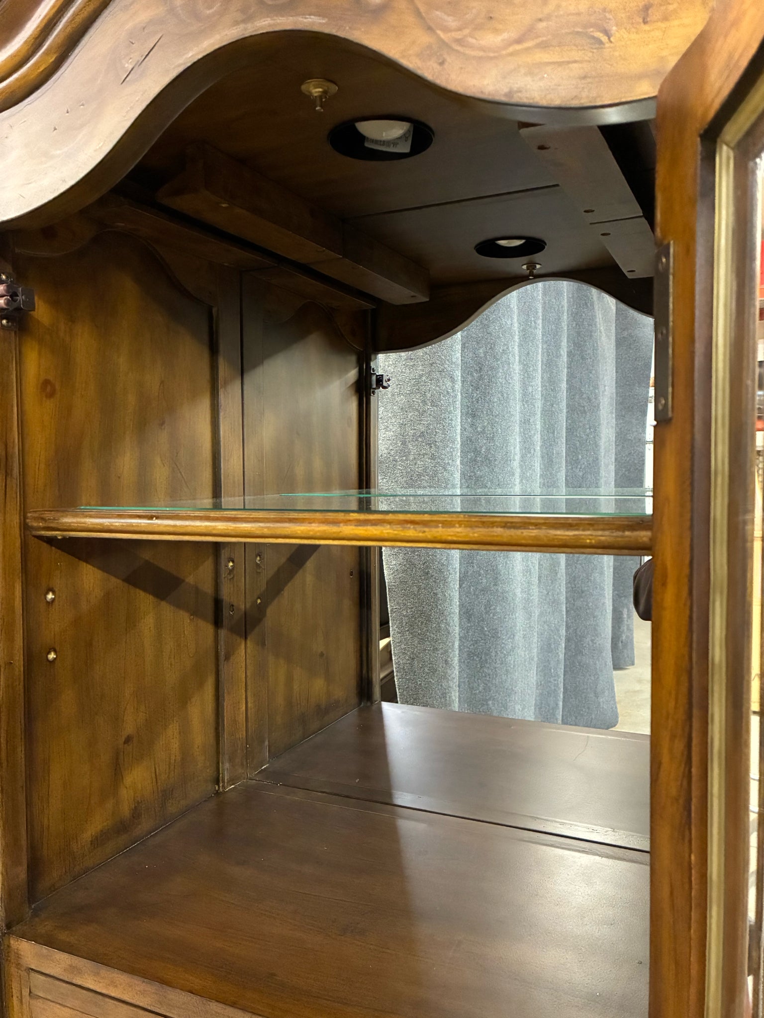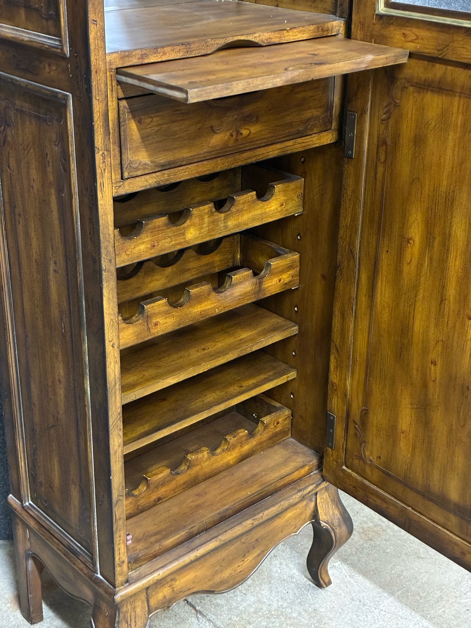 French Country Lighted Wine Cabinet With Velvet Lined Drawer and Pull-out Tray. Dimensions: 25"W 16"D 77"H