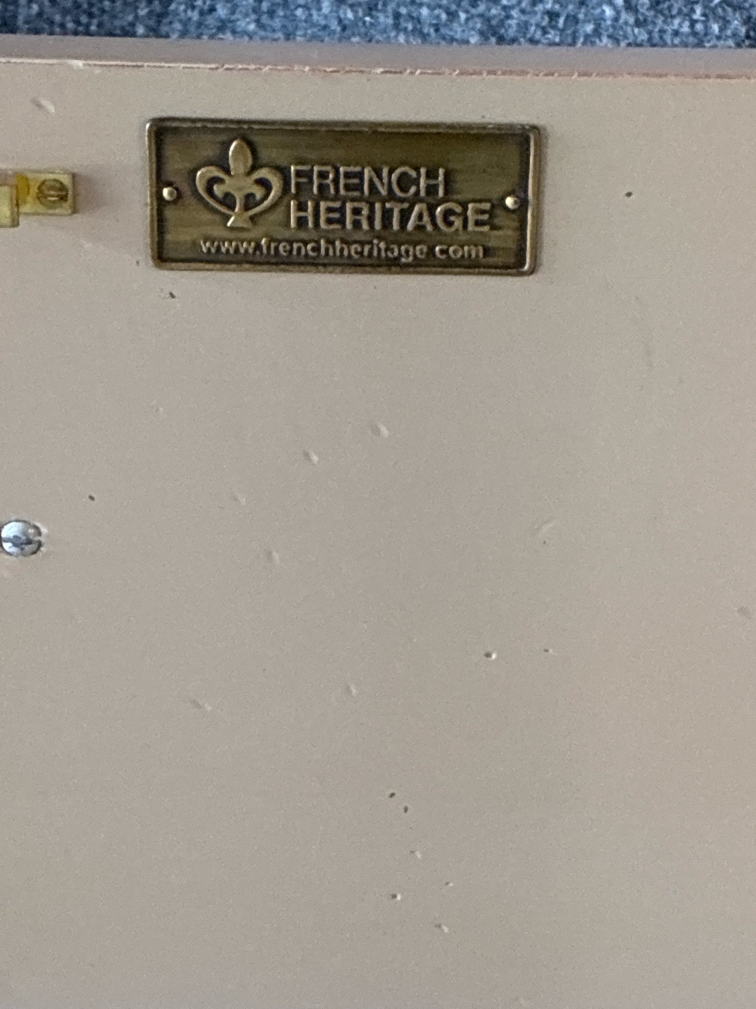 French Heritage Console Cabinet With Cabriole Legs, Scalloped Apron, 2 Doors, and Lower Display Shelf. Dimensions: 43" Width, 14" Depth, 34" Height