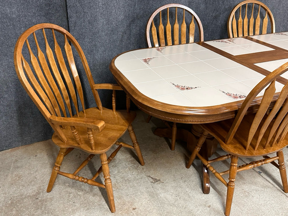 Oak Tile Top Dining Table With Butterfly Leaf and 6 Windsor Chairs. 70"L x 42"W x 30"H. Leaf Extensions 19"