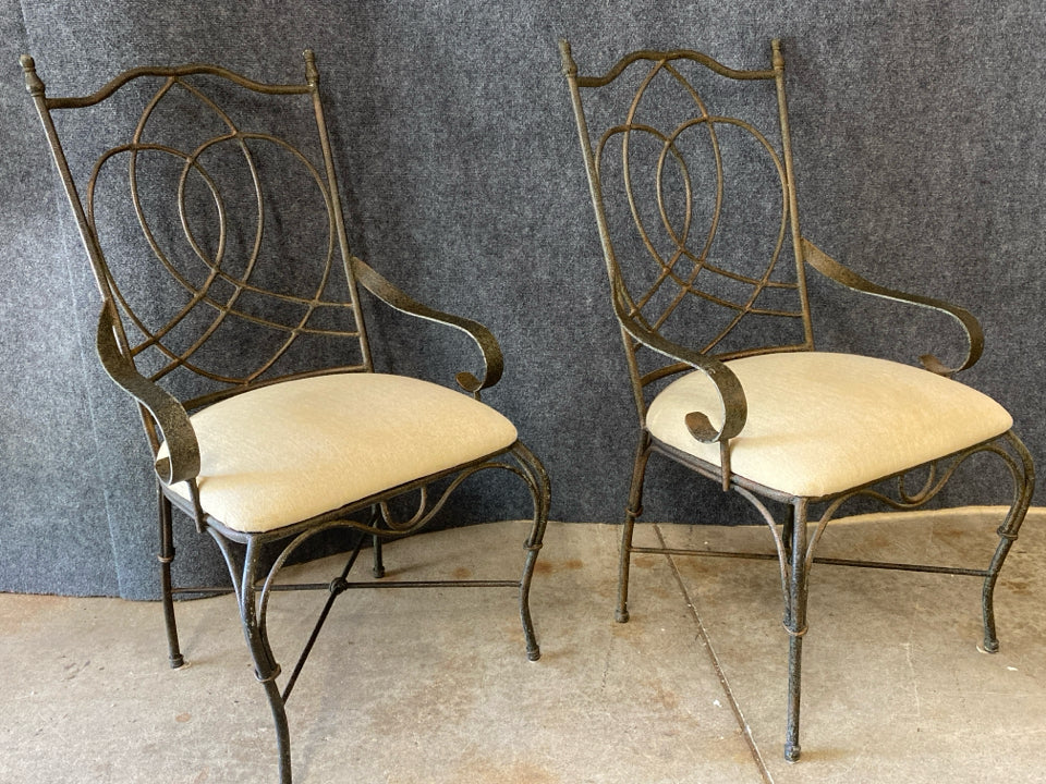 Pair of Wrought Iron Armchairs with Cream Upholstered Seats. Dimensions: length 23" depth 20" height 41"