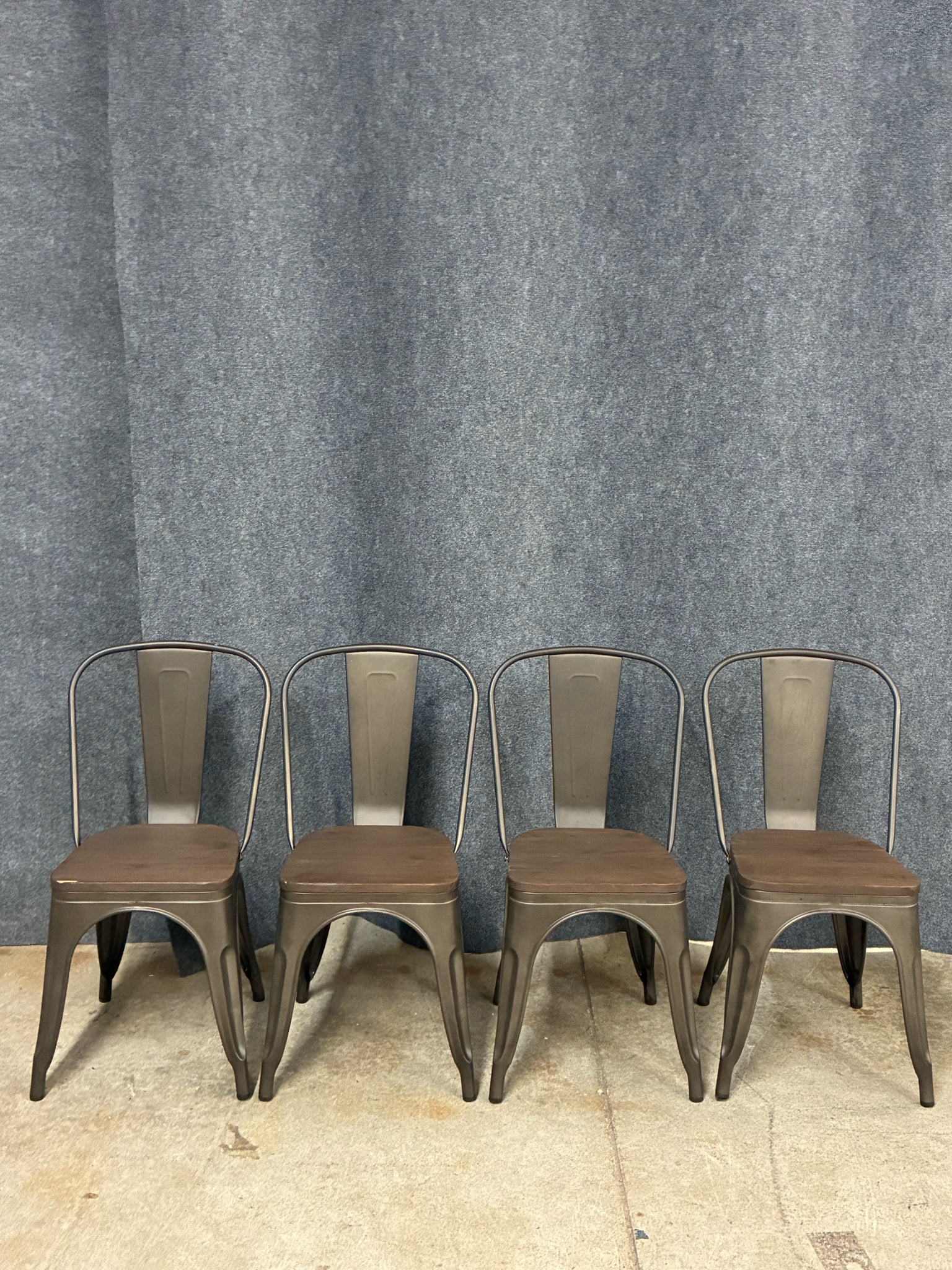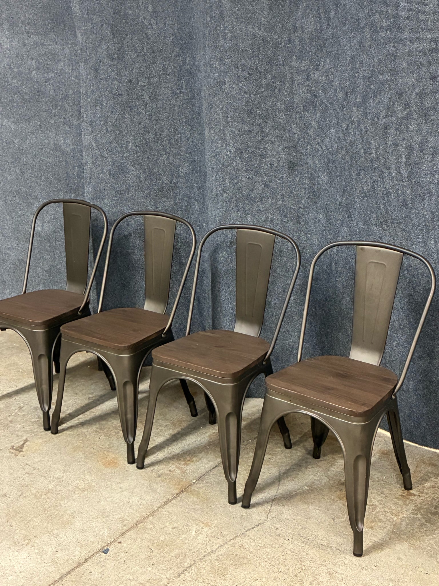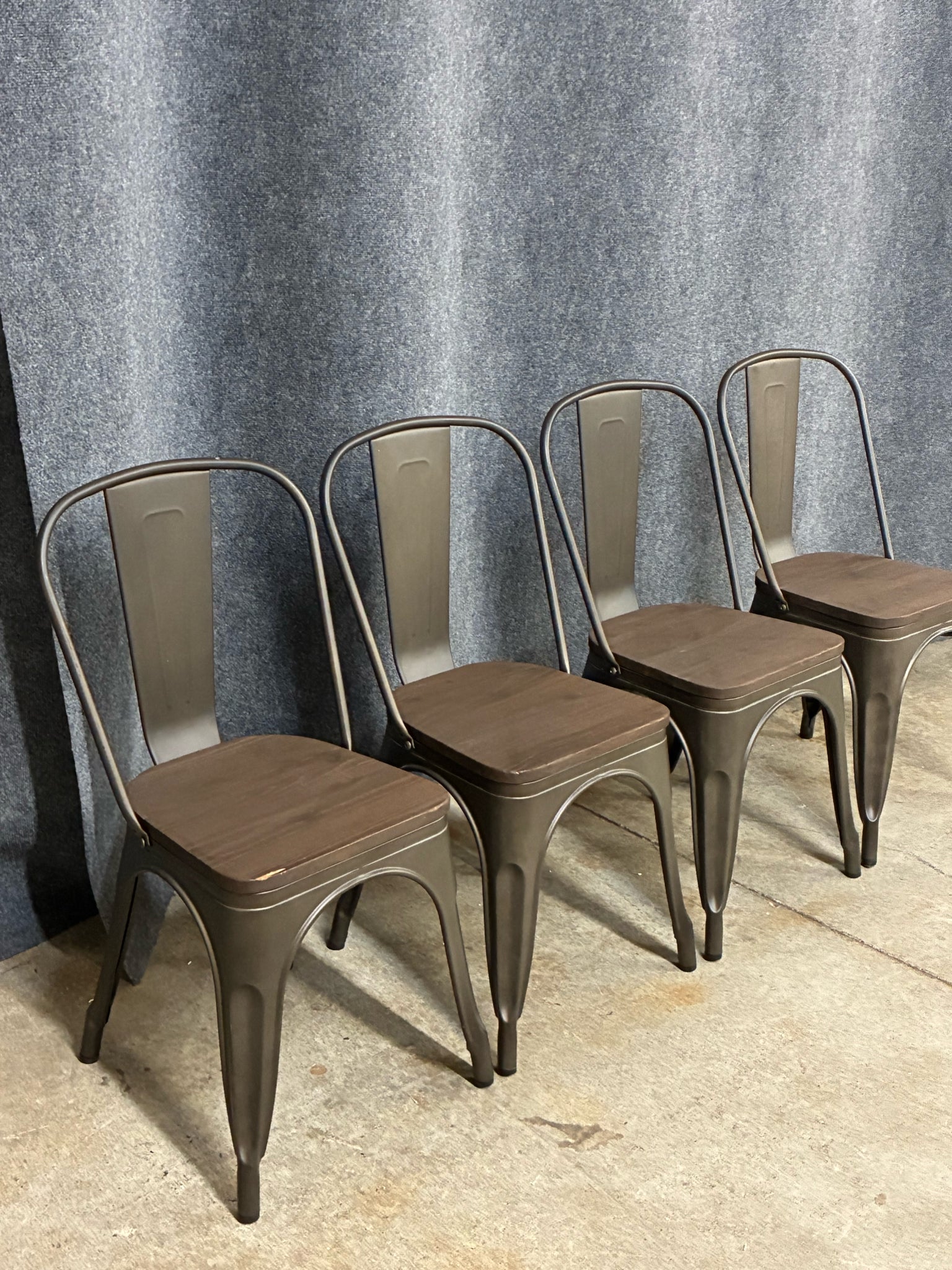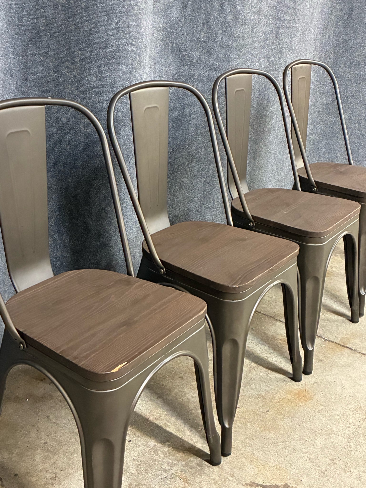 Set of 4 Industrial Metal Cafe Chairs with Wood Seats. Dimensions: 17"W 17"D 33"H