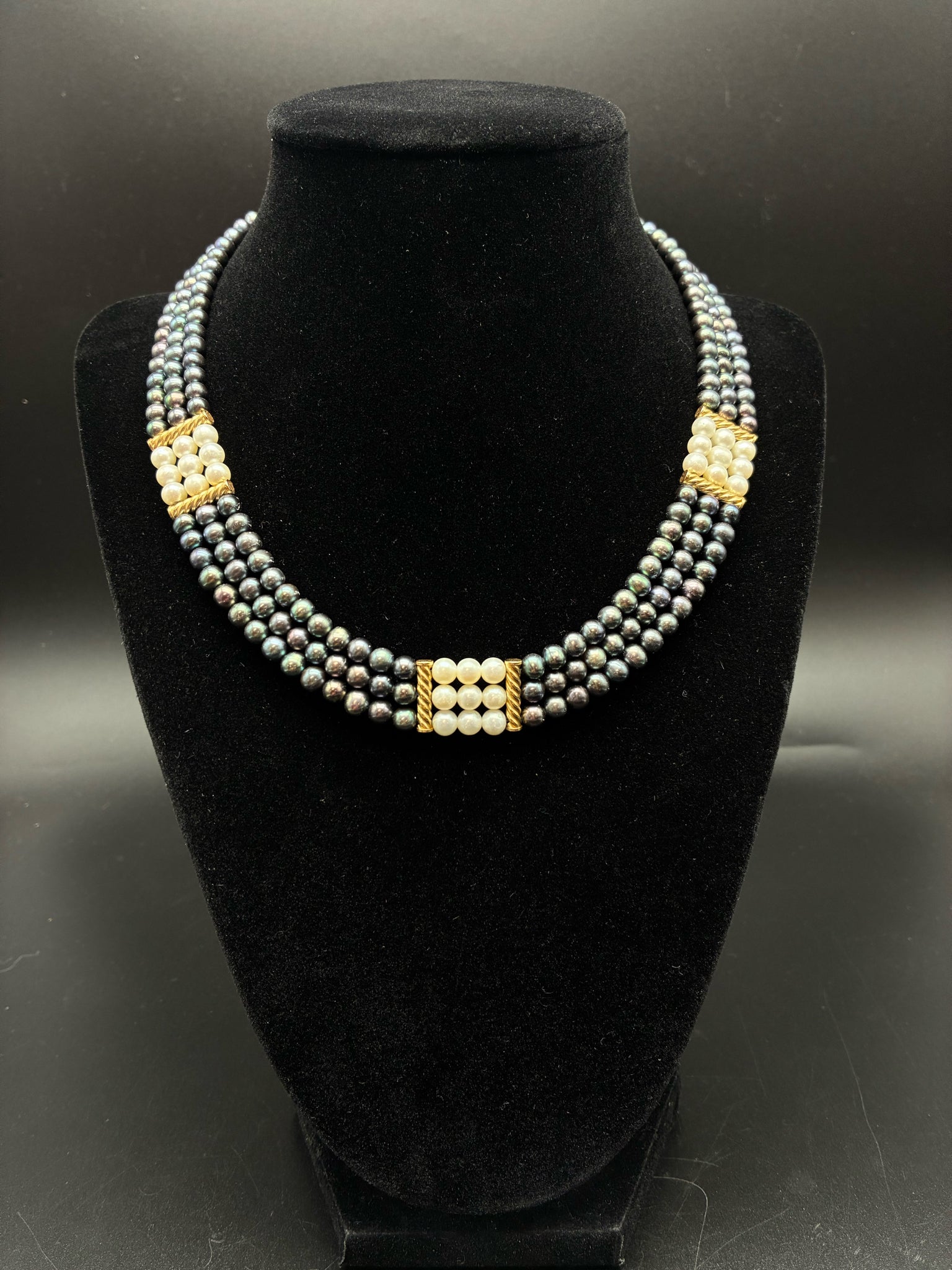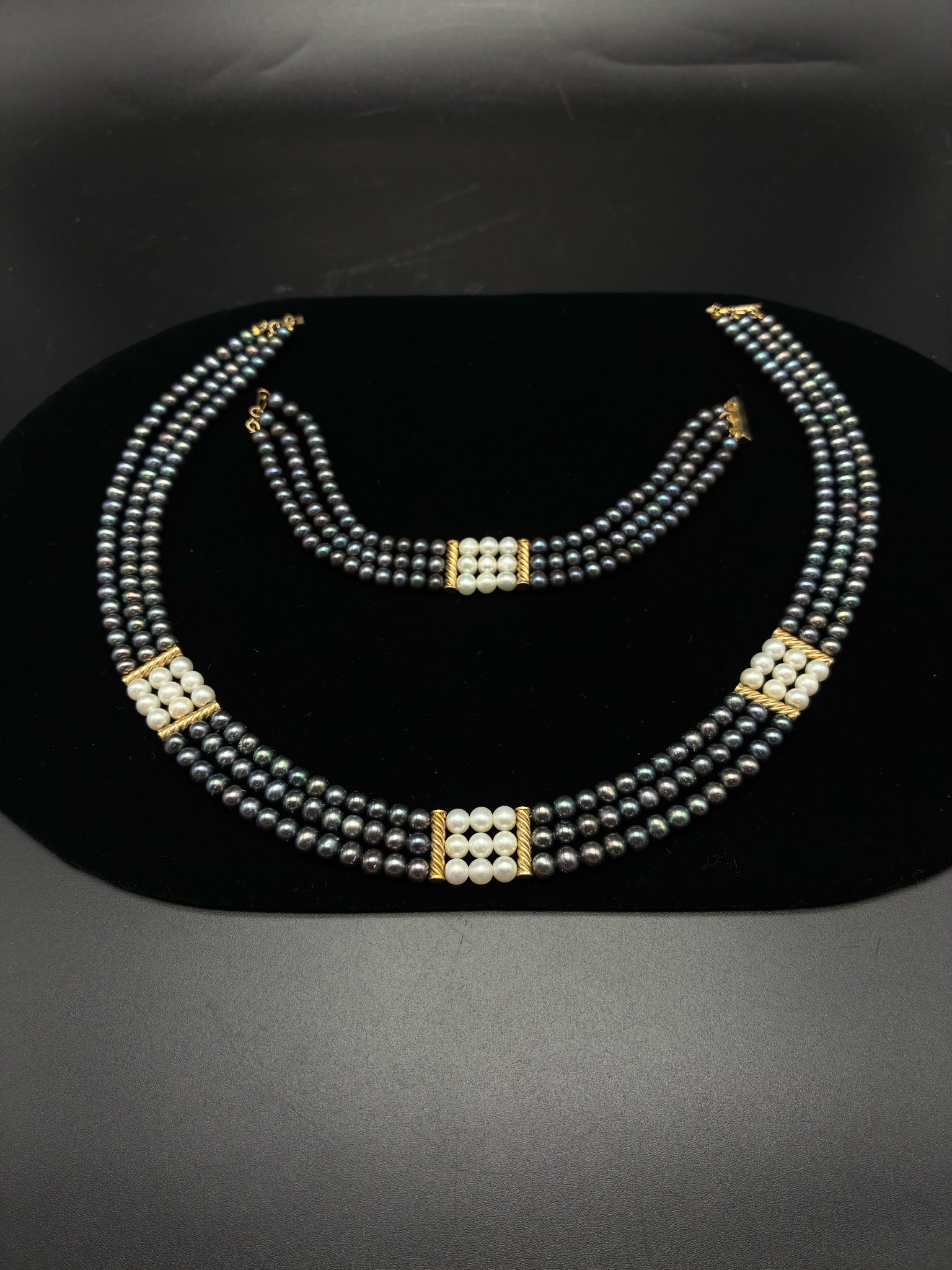 14K triple strand peacock & white pearl 16" necklace + 6.5" bracelet set
