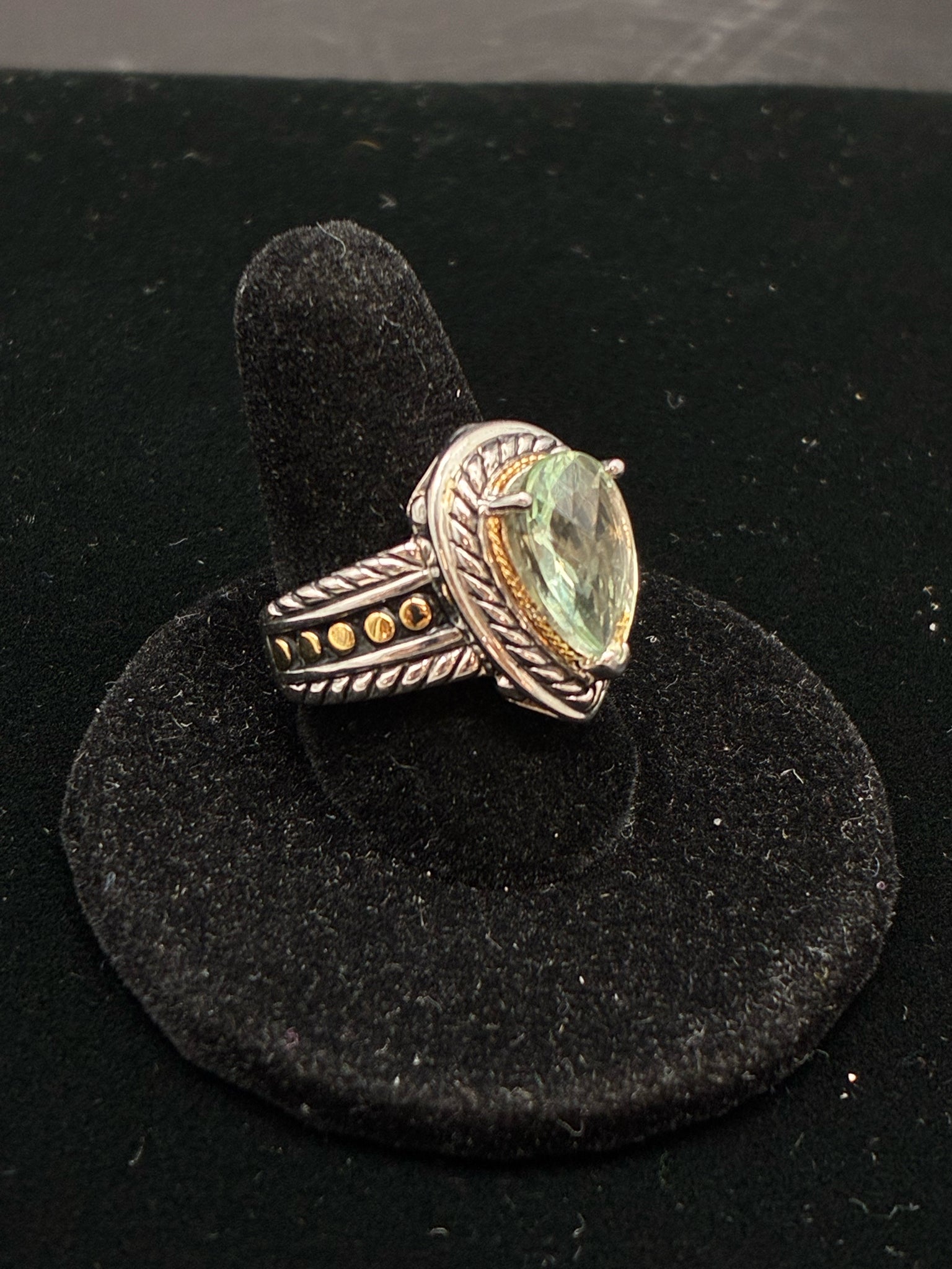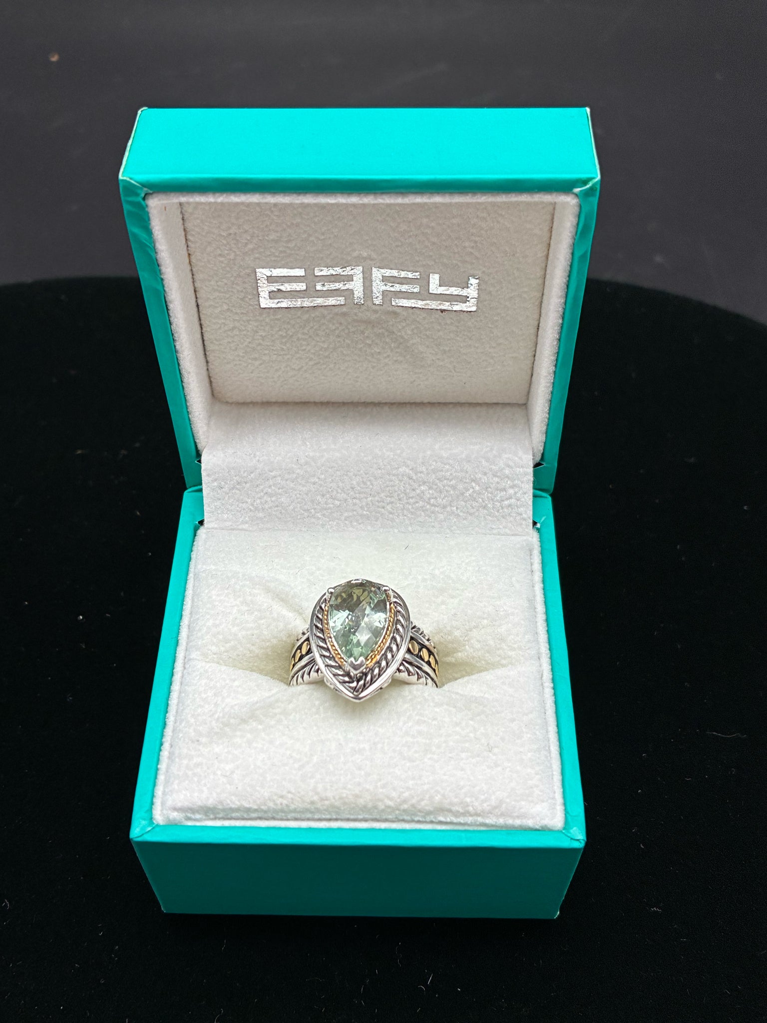 Effy 18K sterling silver ring with pear cut green stone, in Effy box