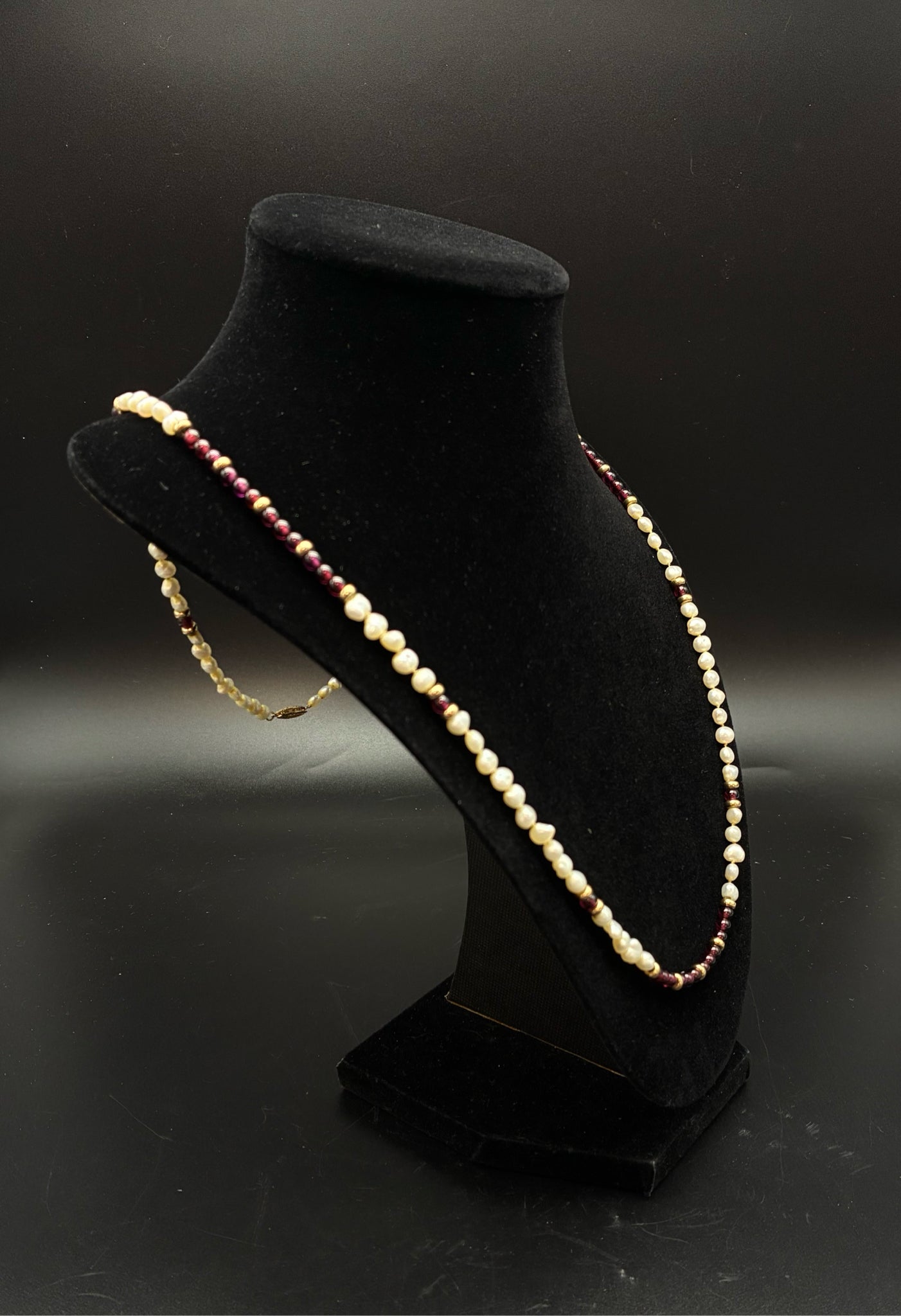 14K yellow gold 27" strand pearl, garnet and gold beaded necklace