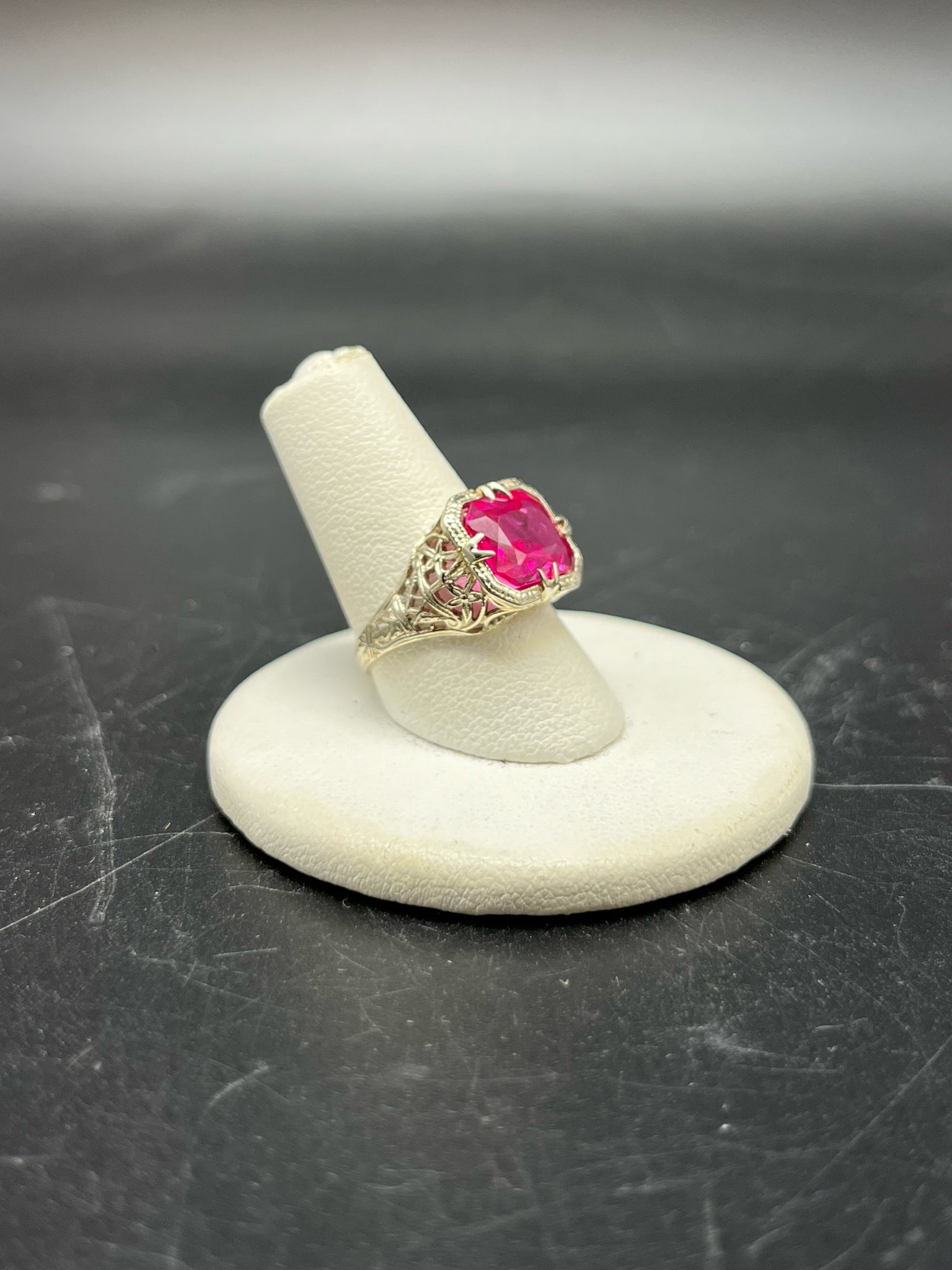 14K white gold filigree pink gemstone ring, size 4.5