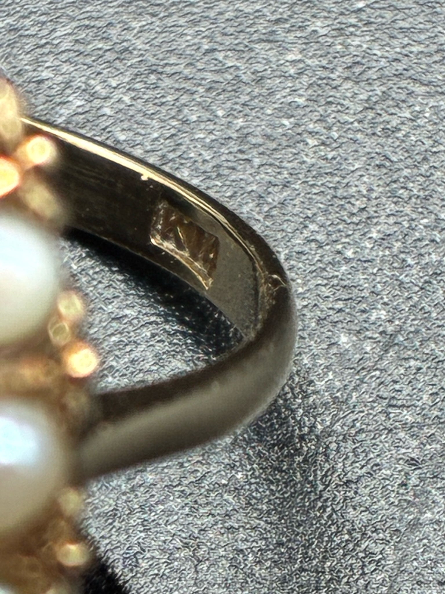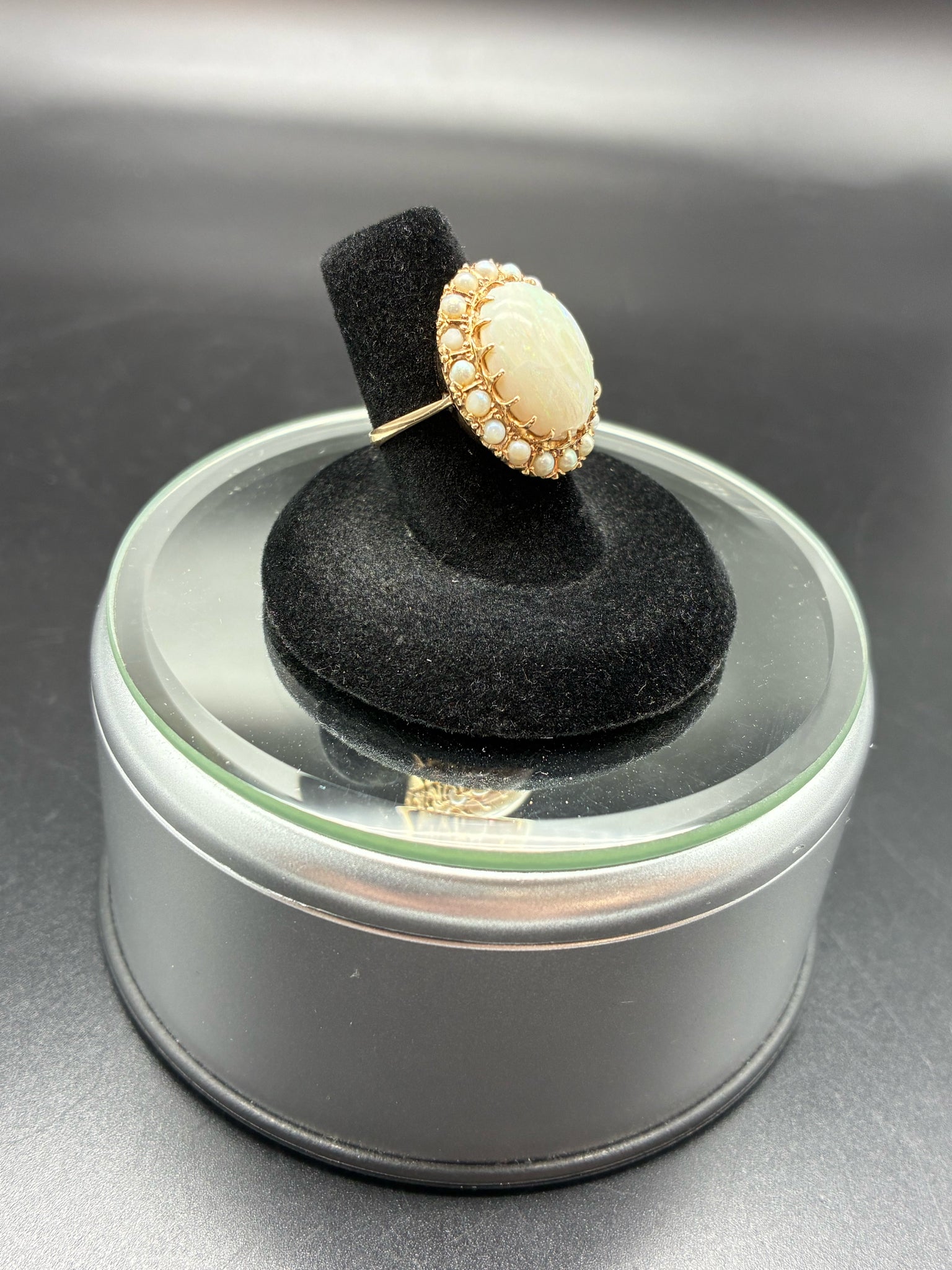 14K gold Victorian style oval cabochon opal with seed pearls ring. Note: finish worn off on several pearl beads.