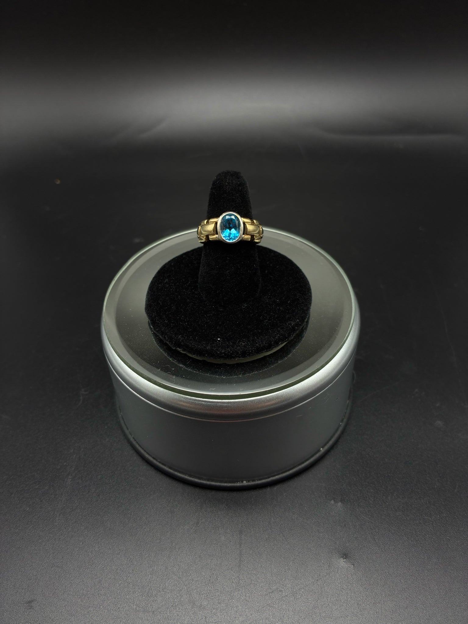 10K two tone gold ring with oval blue stone, size 4.75