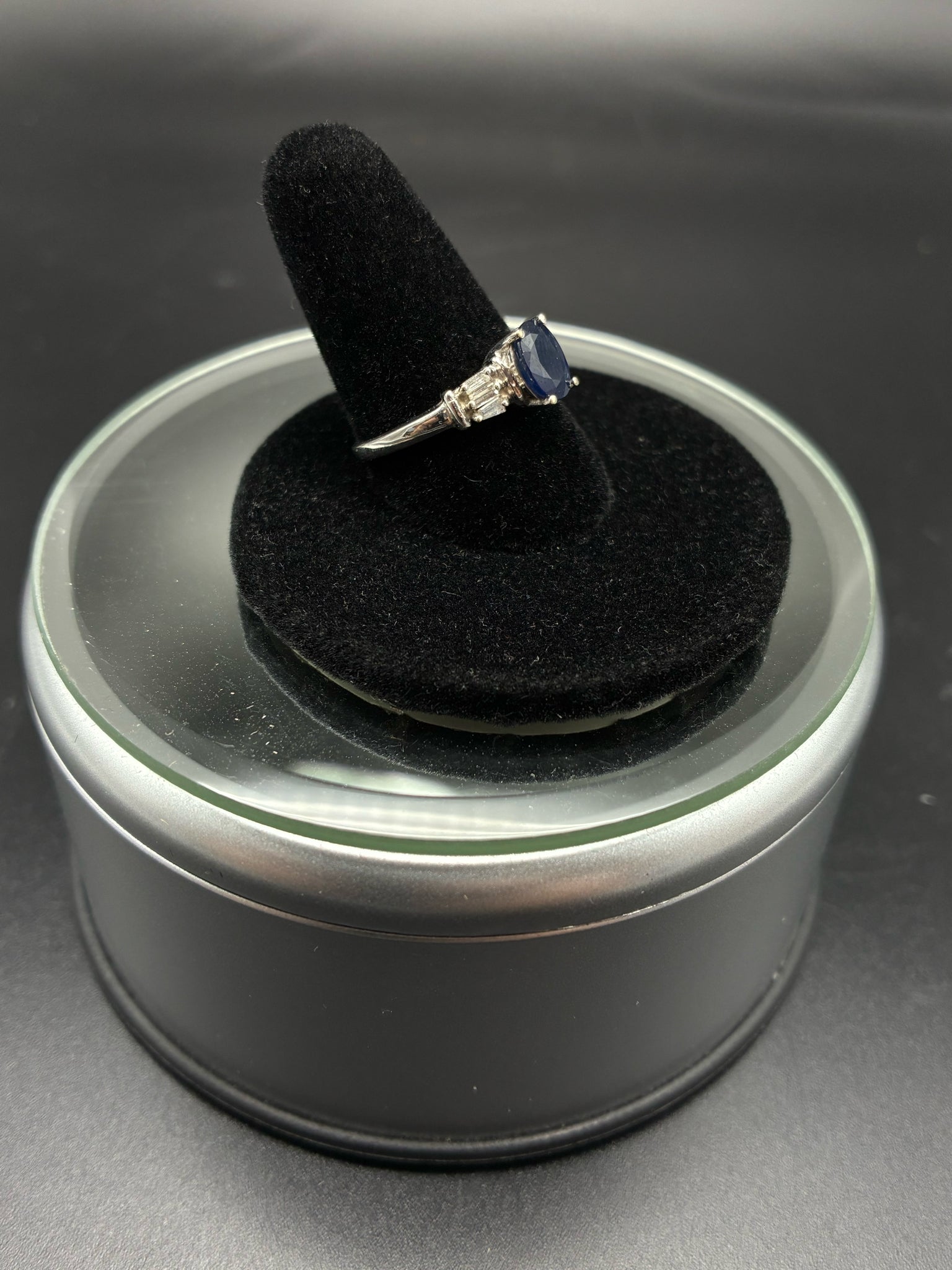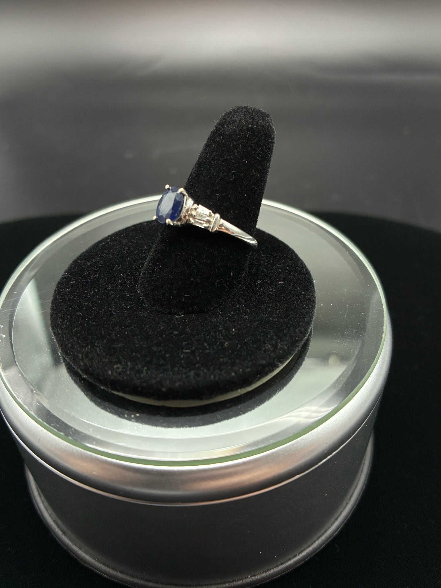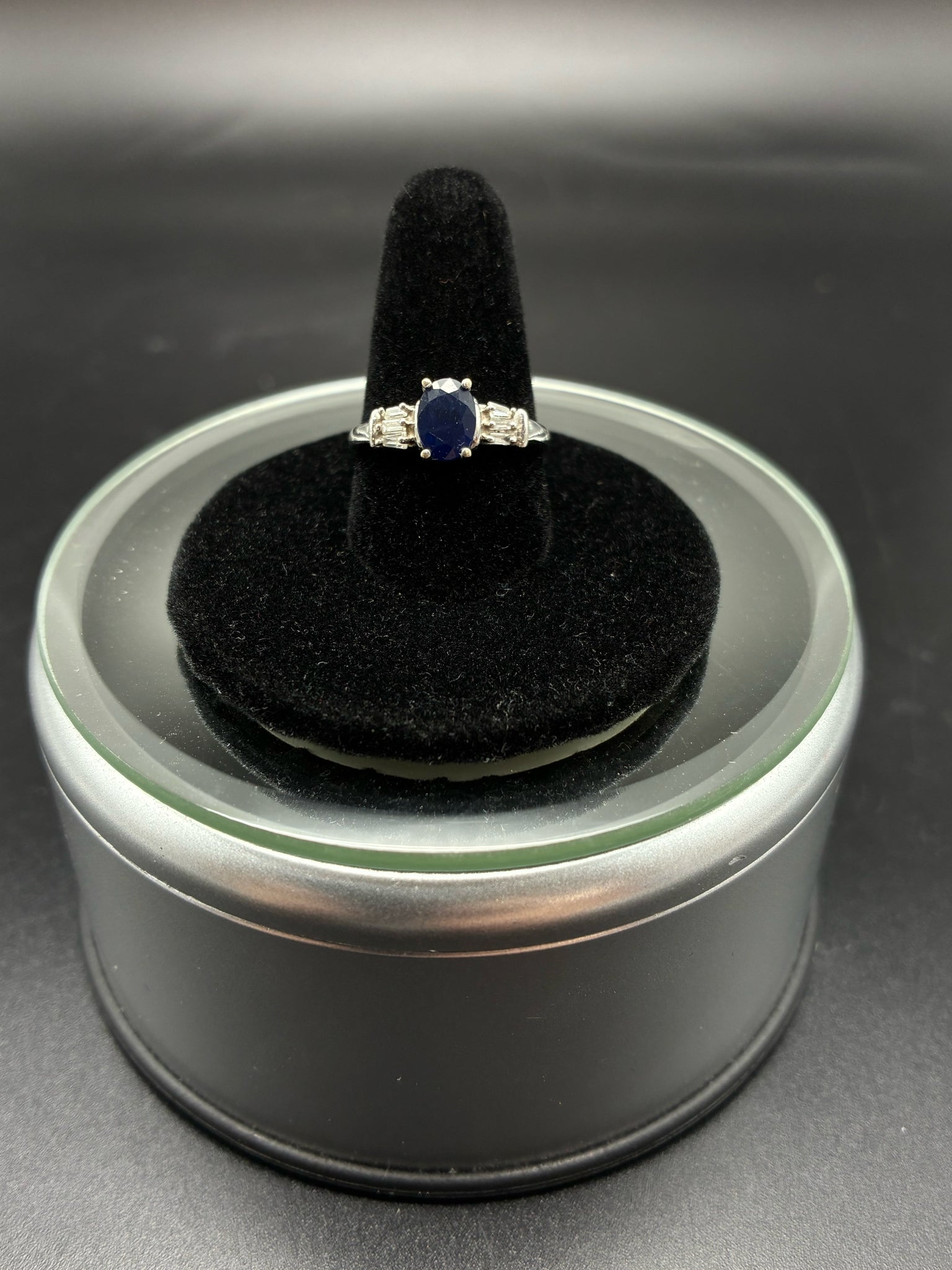 14K white gold ring with oval cut sapphire & diamond accents, size 7