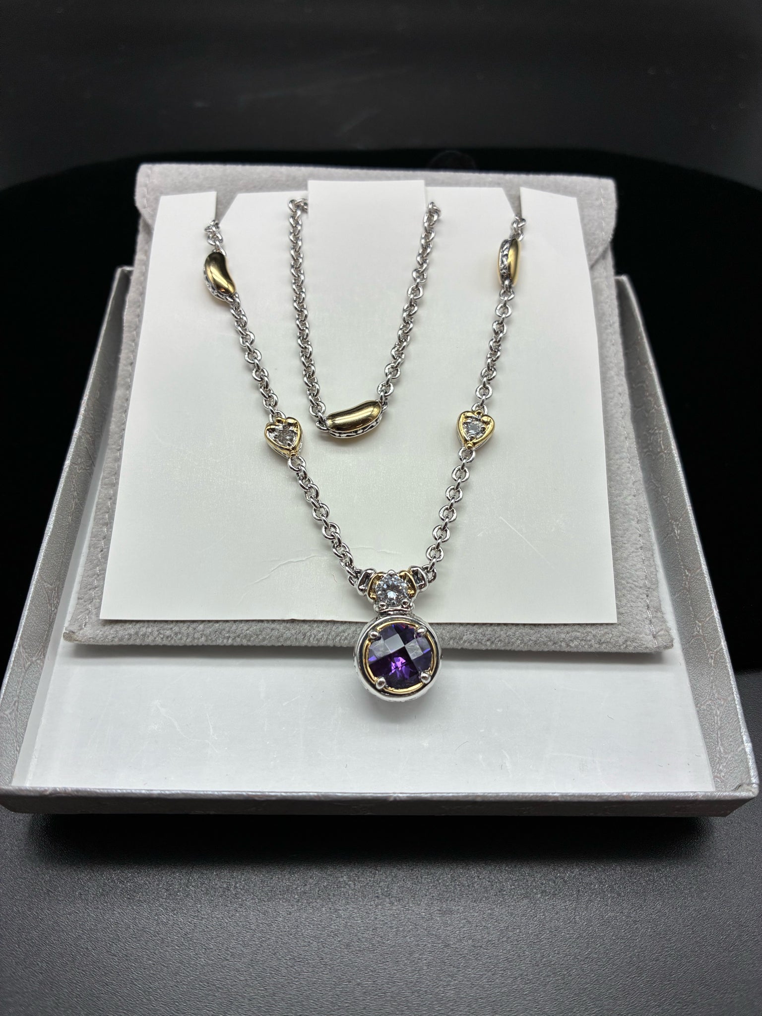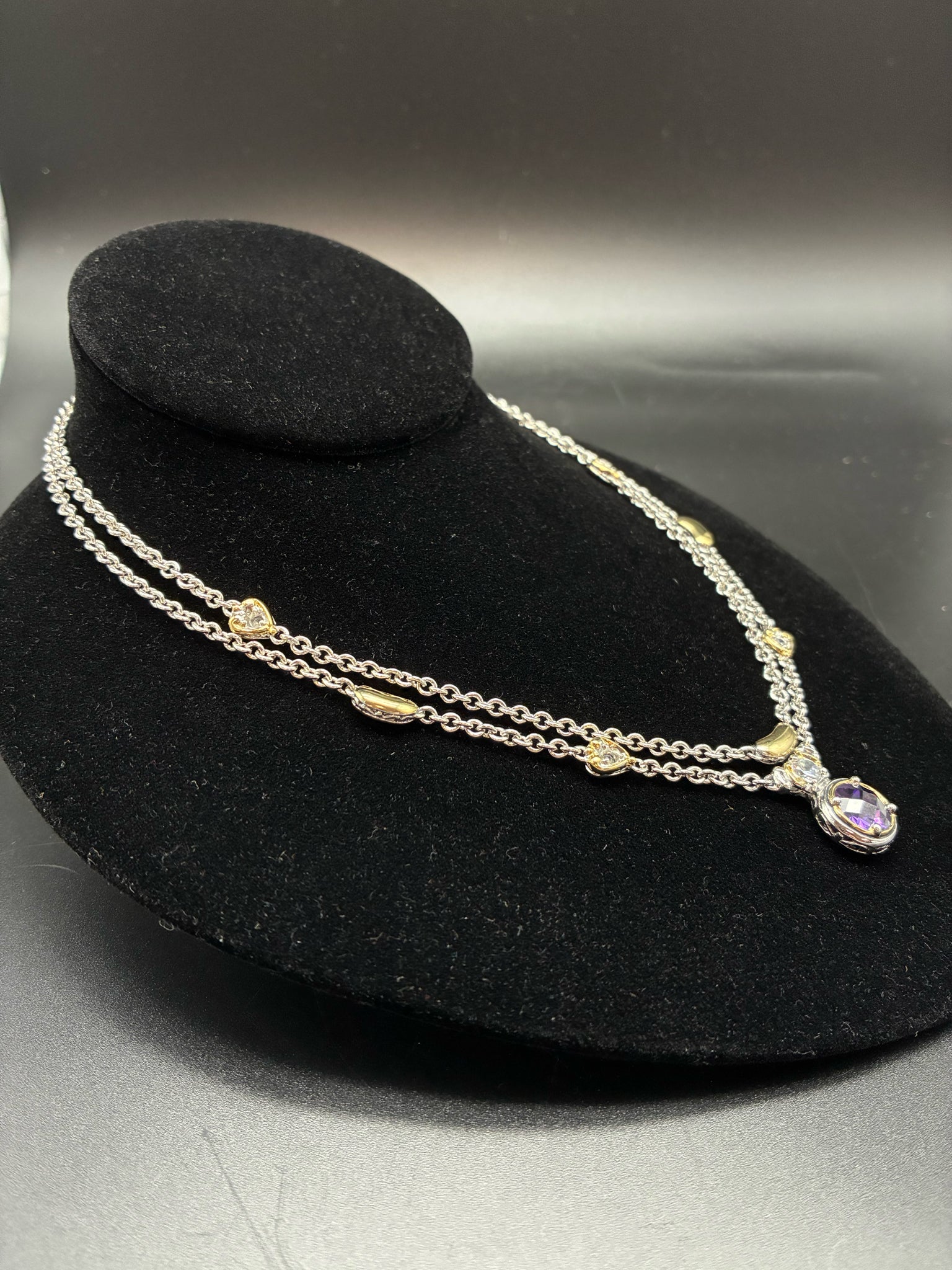 John Medeiros double strand choker necklace with round purple stone pendant (with pouch)