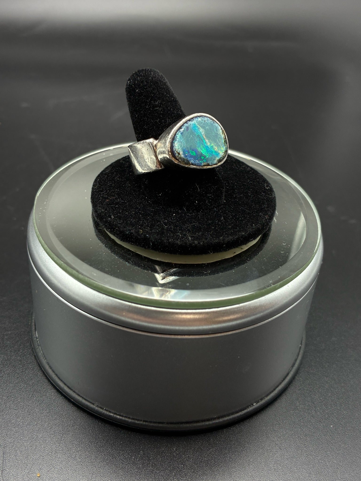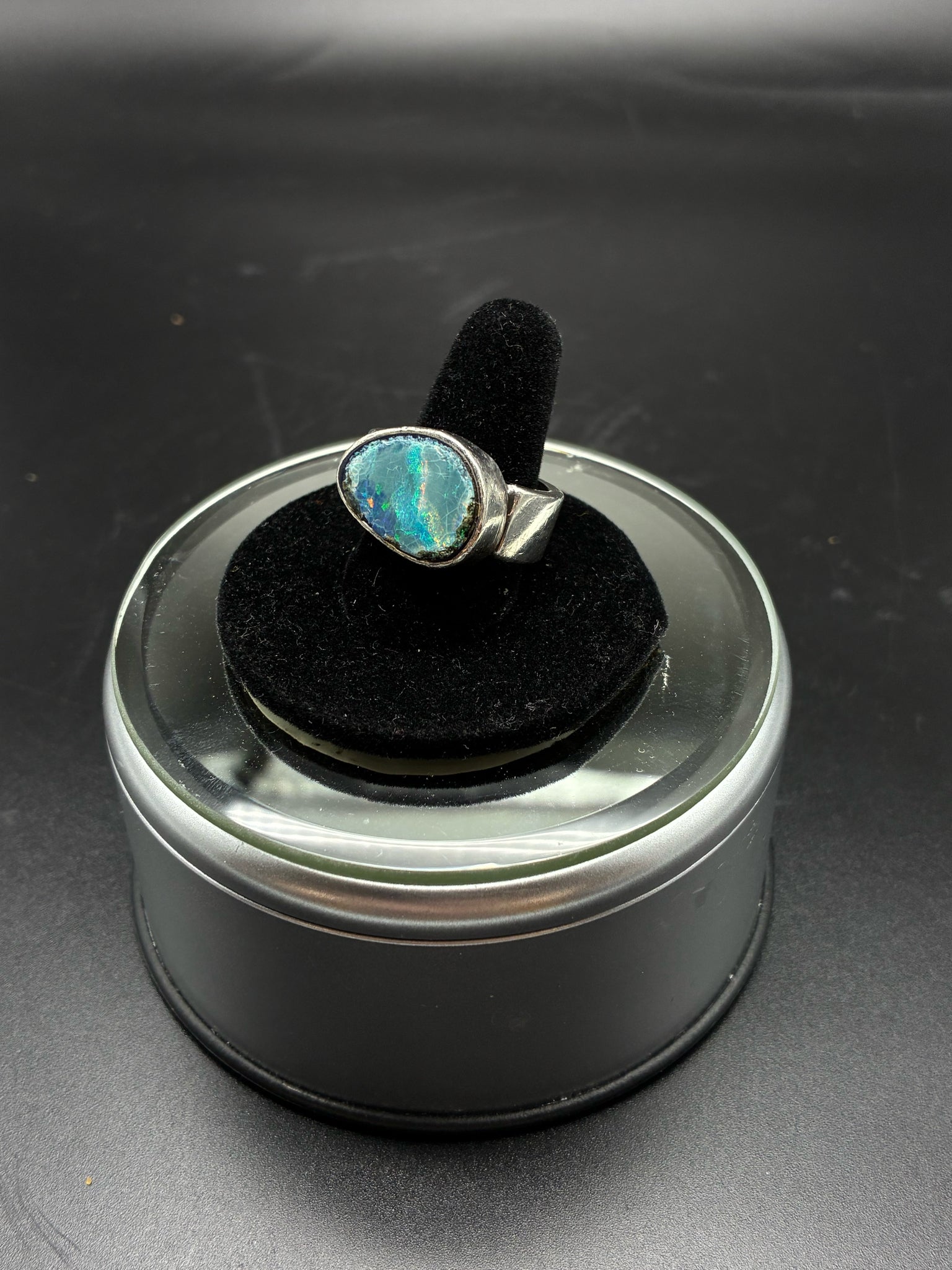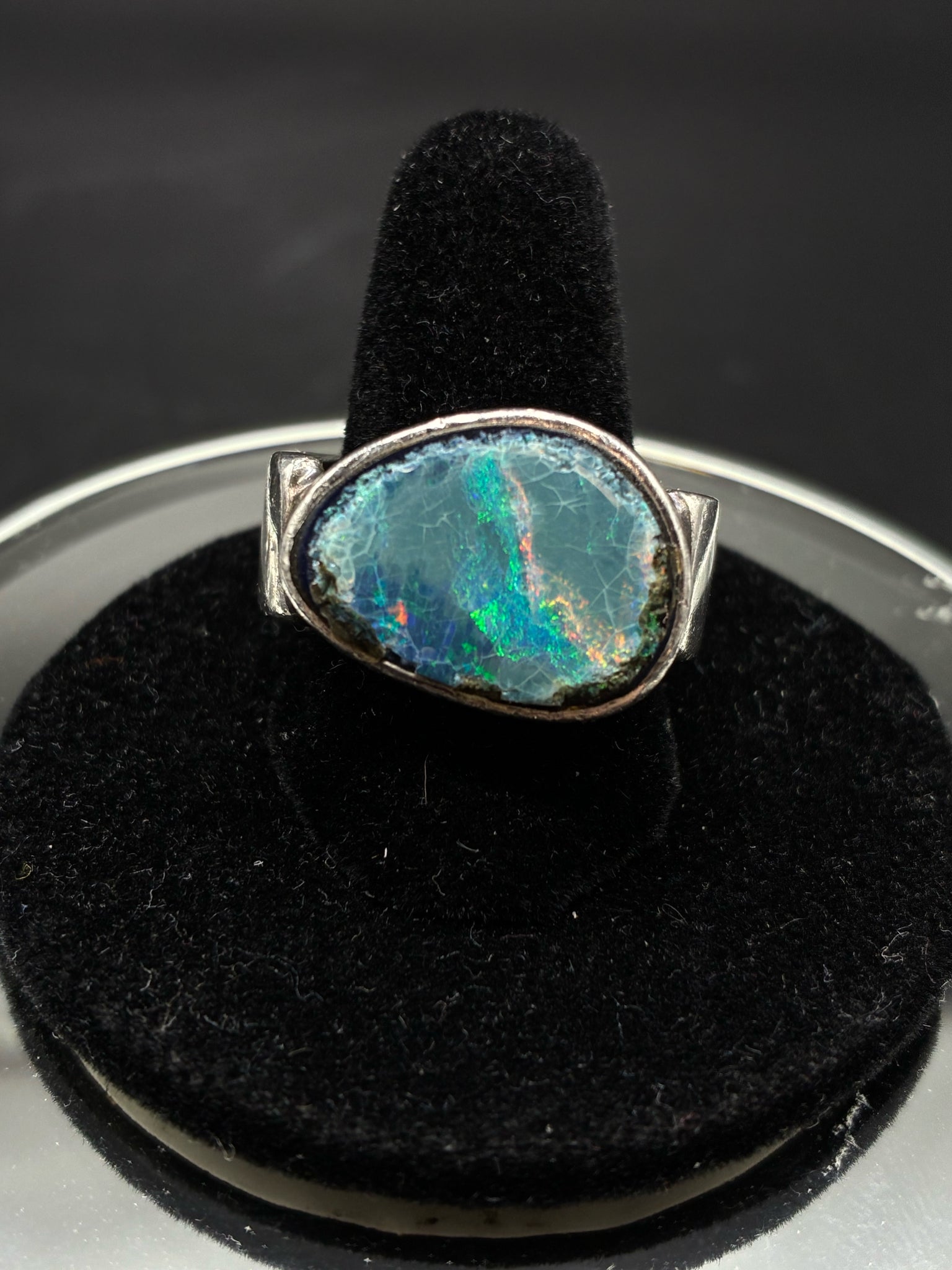 Artisan made silver wide band ring with freeform multi-color natural opal with red flecks (note: very likely sterling but not marked). Total weight 13.5 g