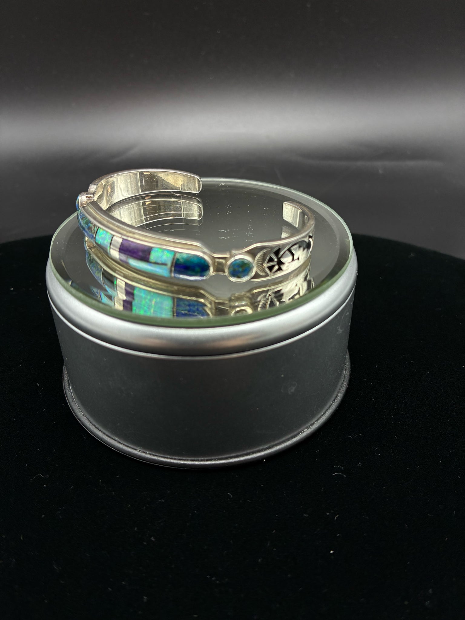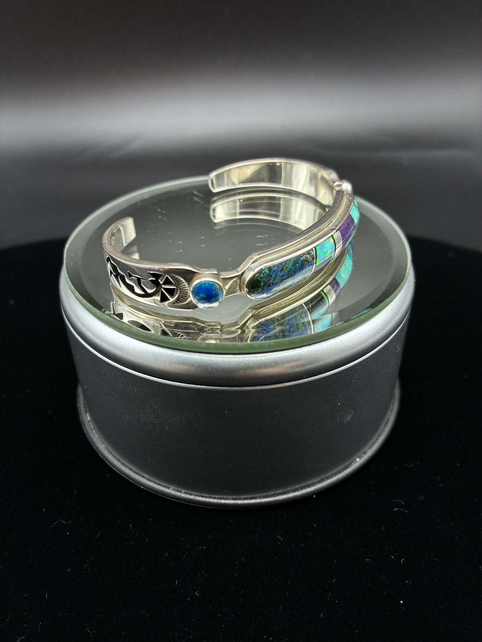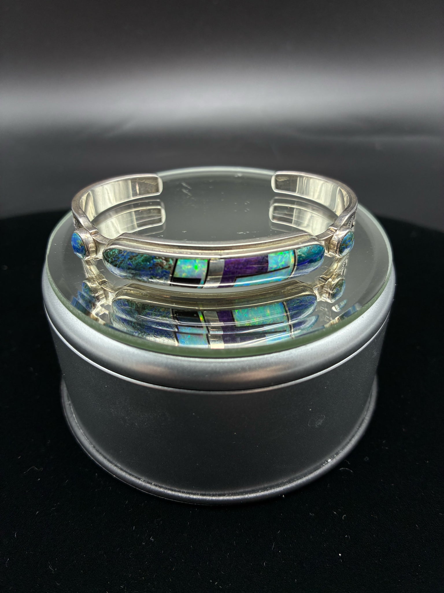 Signed Cecil Ashley Navajo sterling silver kokopelli with multi gemstone inlay cuff bracelet