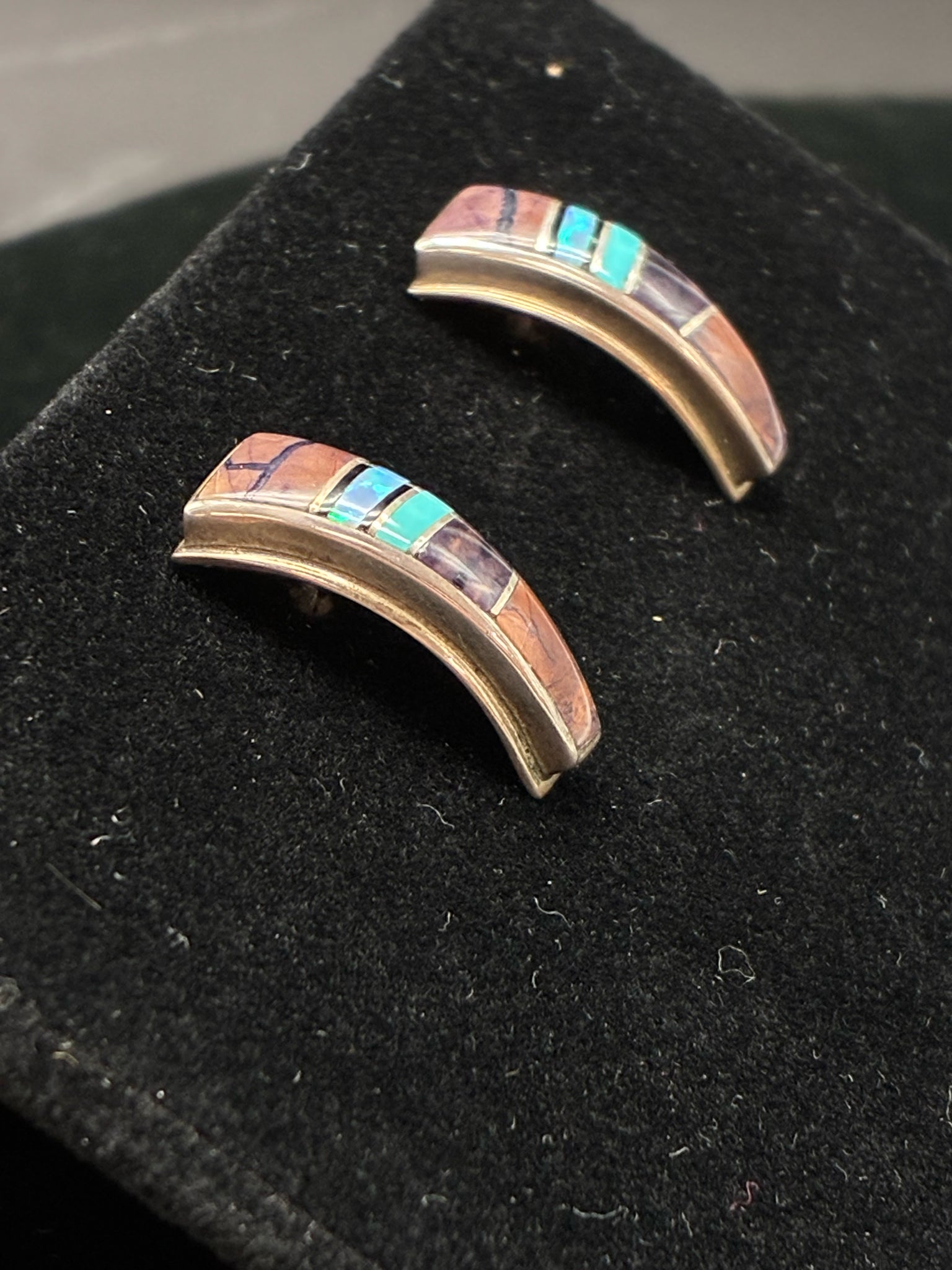 Cathy Webster signed Navajo sterling silver inlaid multi stone earrings