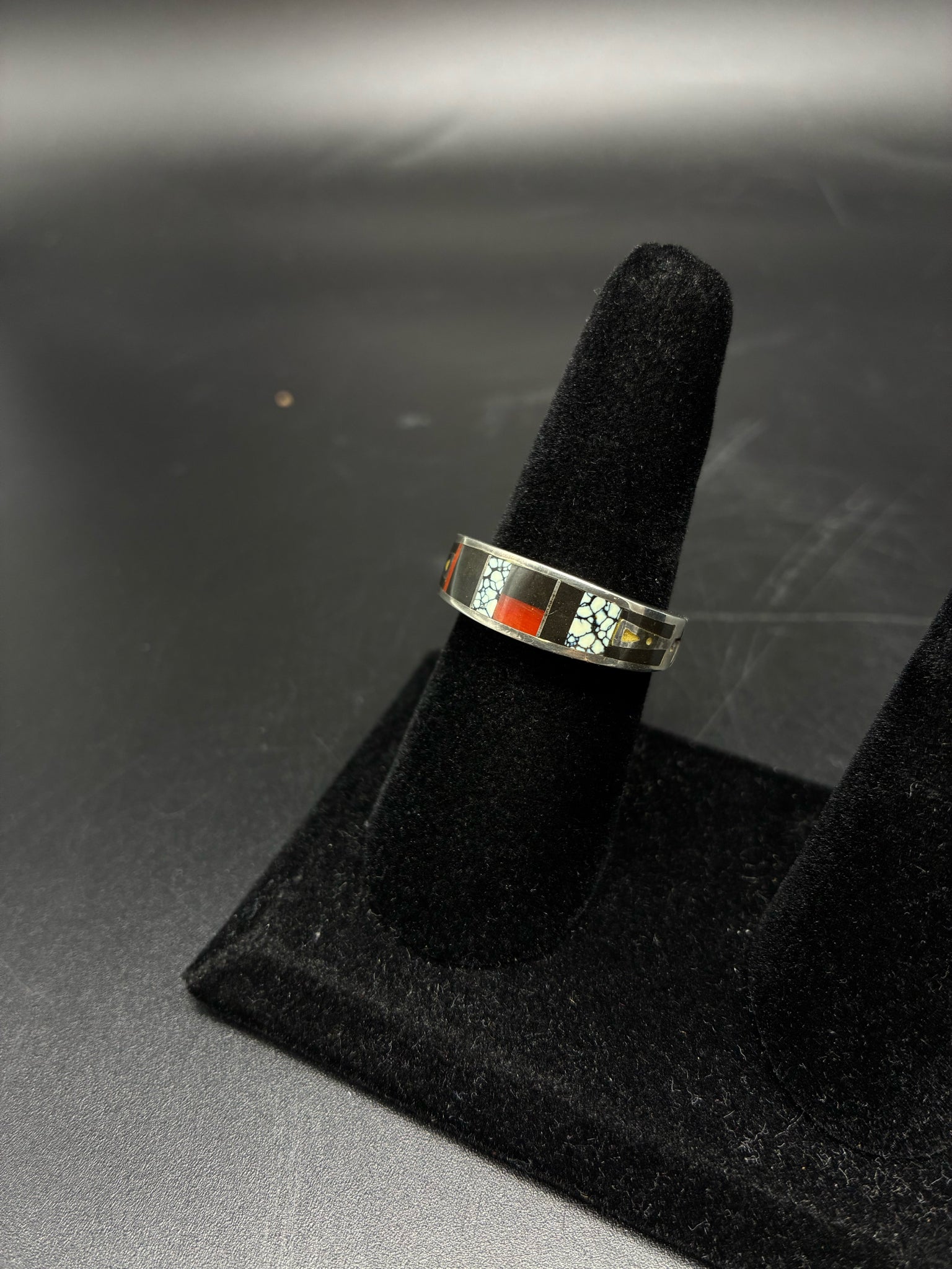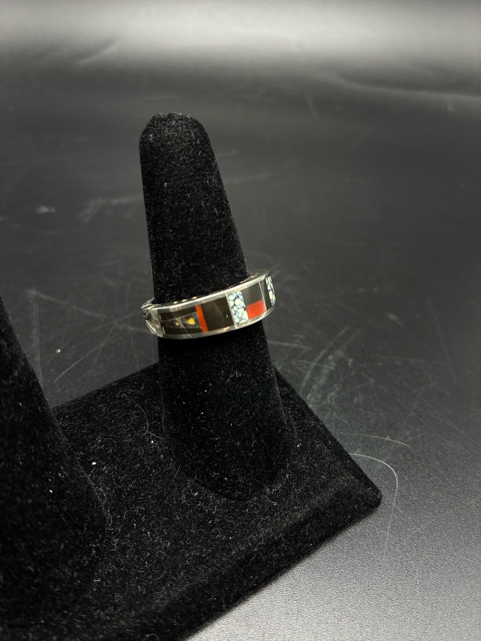 Navajo signed sterling silver multi stone inlay ring, size 9.5