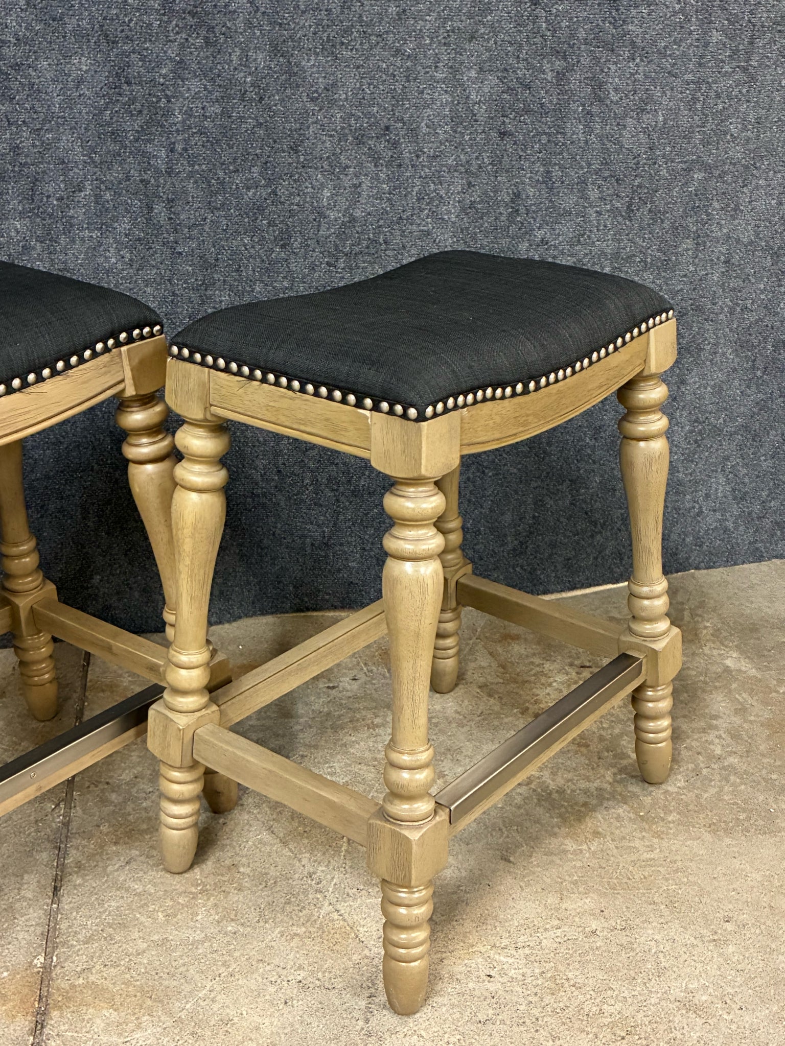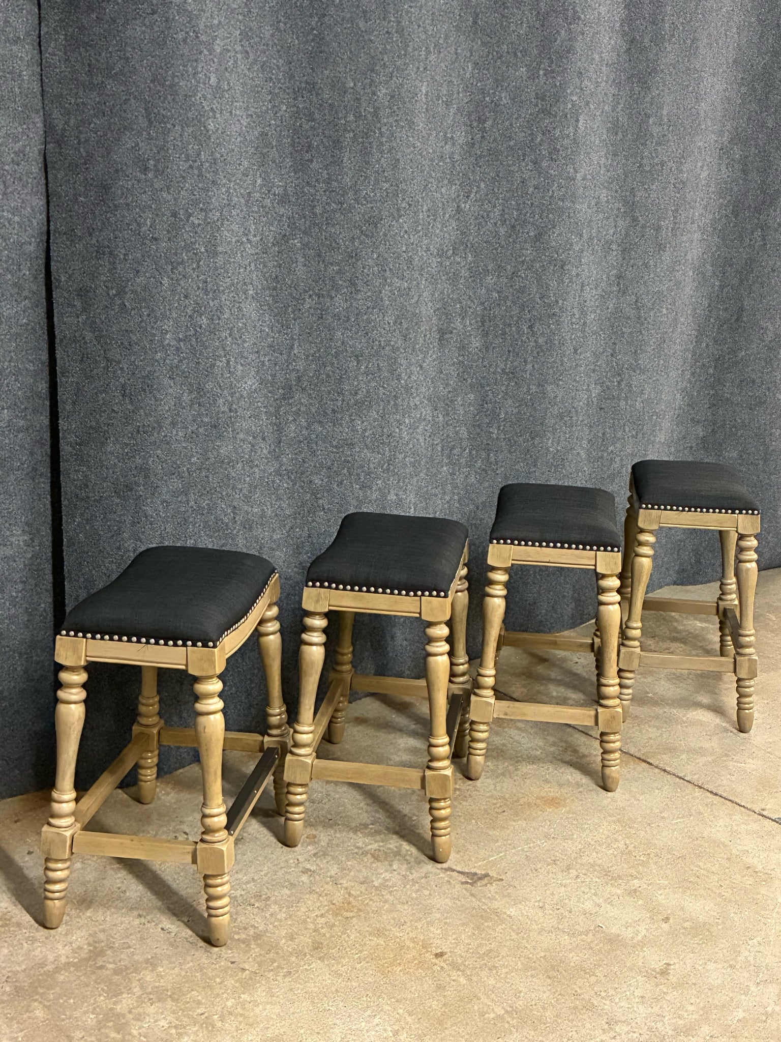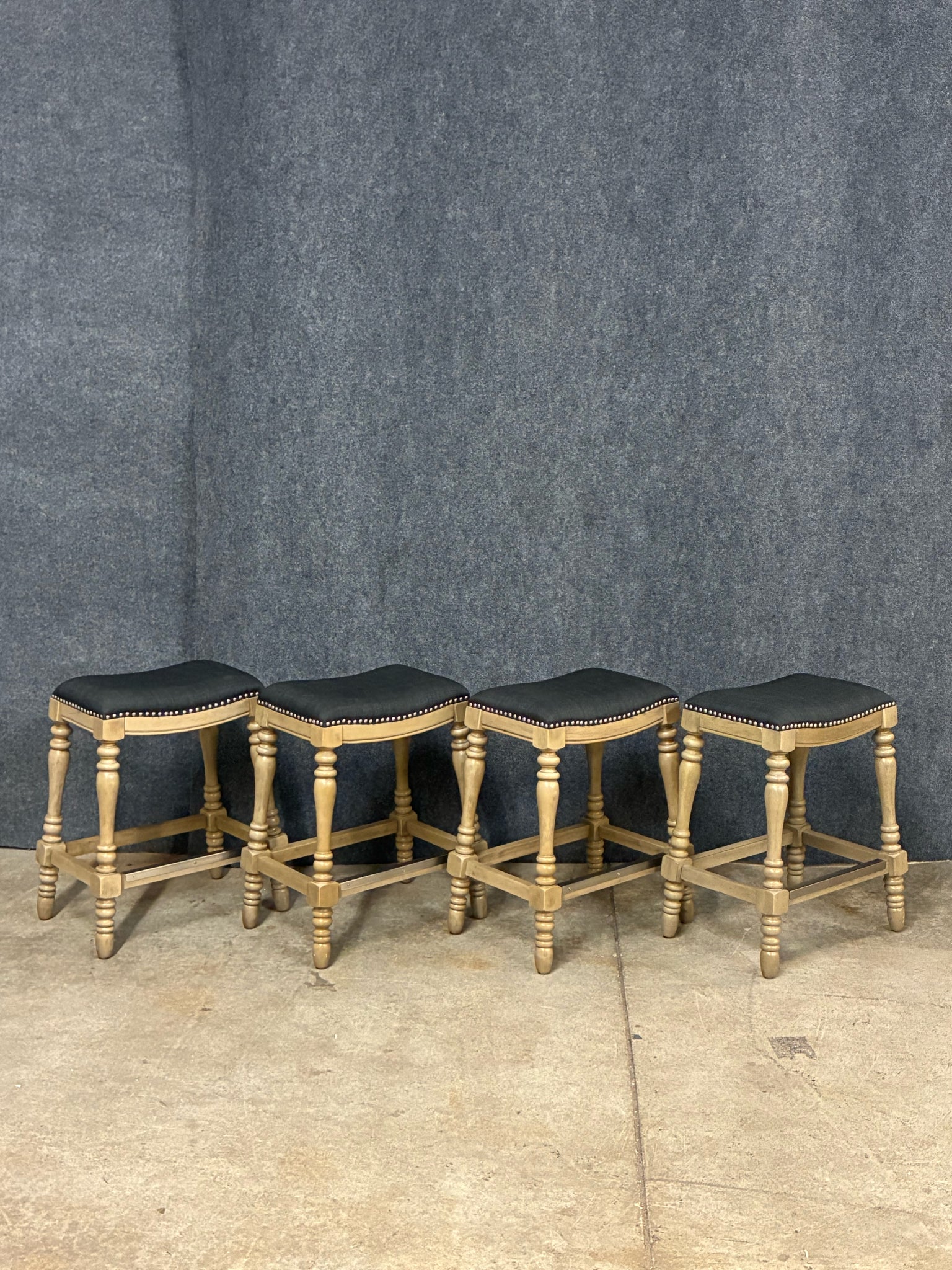 Set of 4 Turned-Leg Counter Height Saddle Stools, Black Fabric Seats. Dimensions: 18"W 12"D 25"H