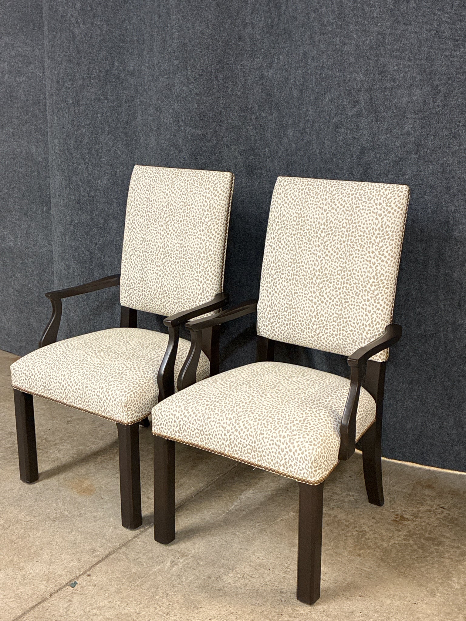 Pair of Ethan Allen Arm "Drew" Dining Chairs With Nailhead Trim. Dimensions: 23.5"W 26"D 41"H