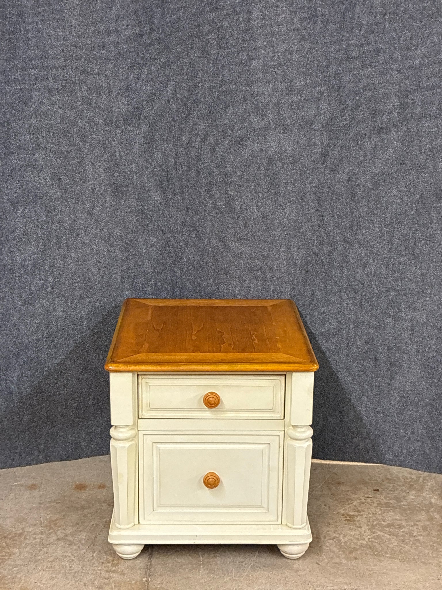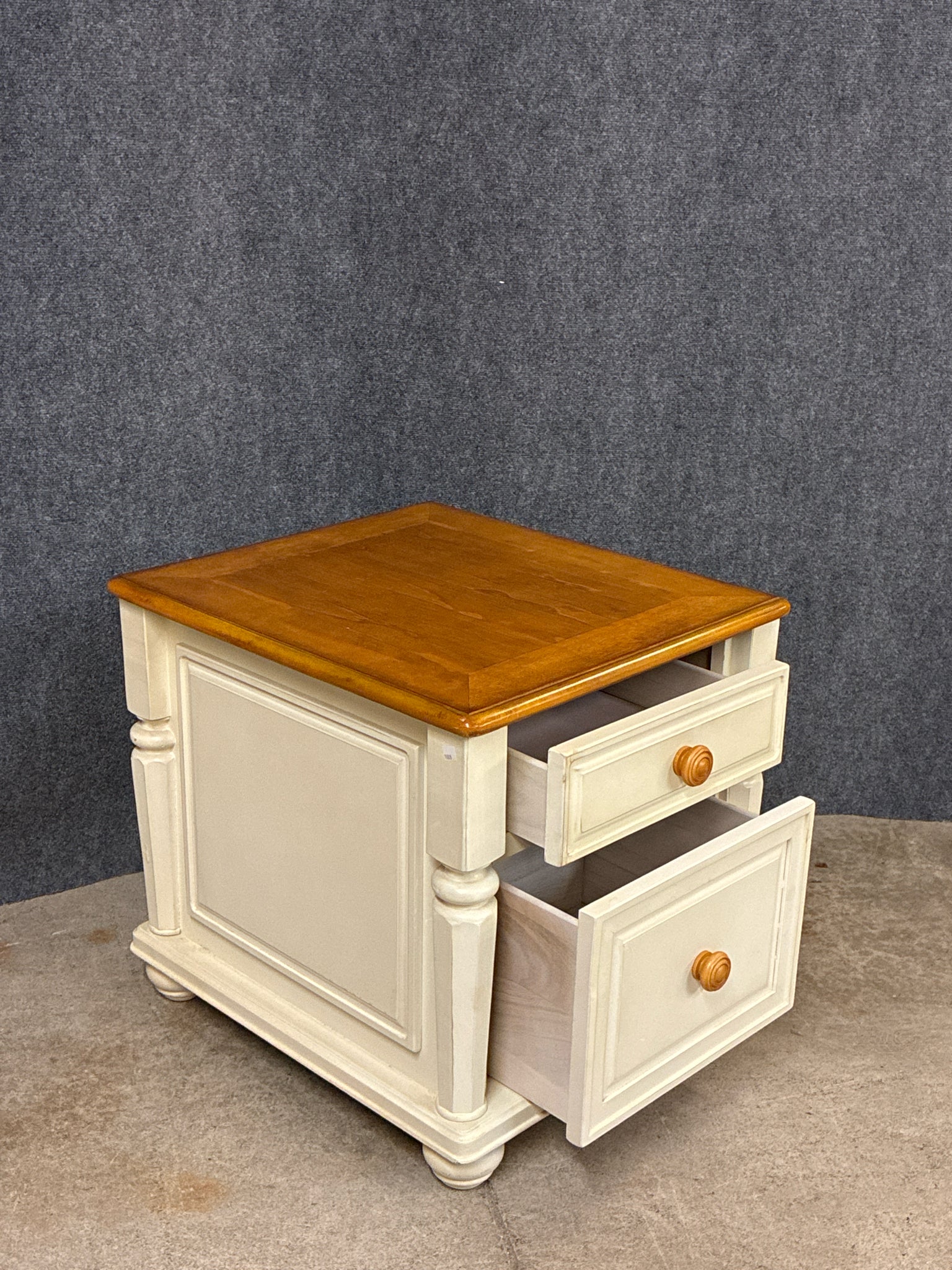 Two-Tone Side Table, Cream/Natural With 2 Drawers. Dimensions: 24"W 27"D 25"H