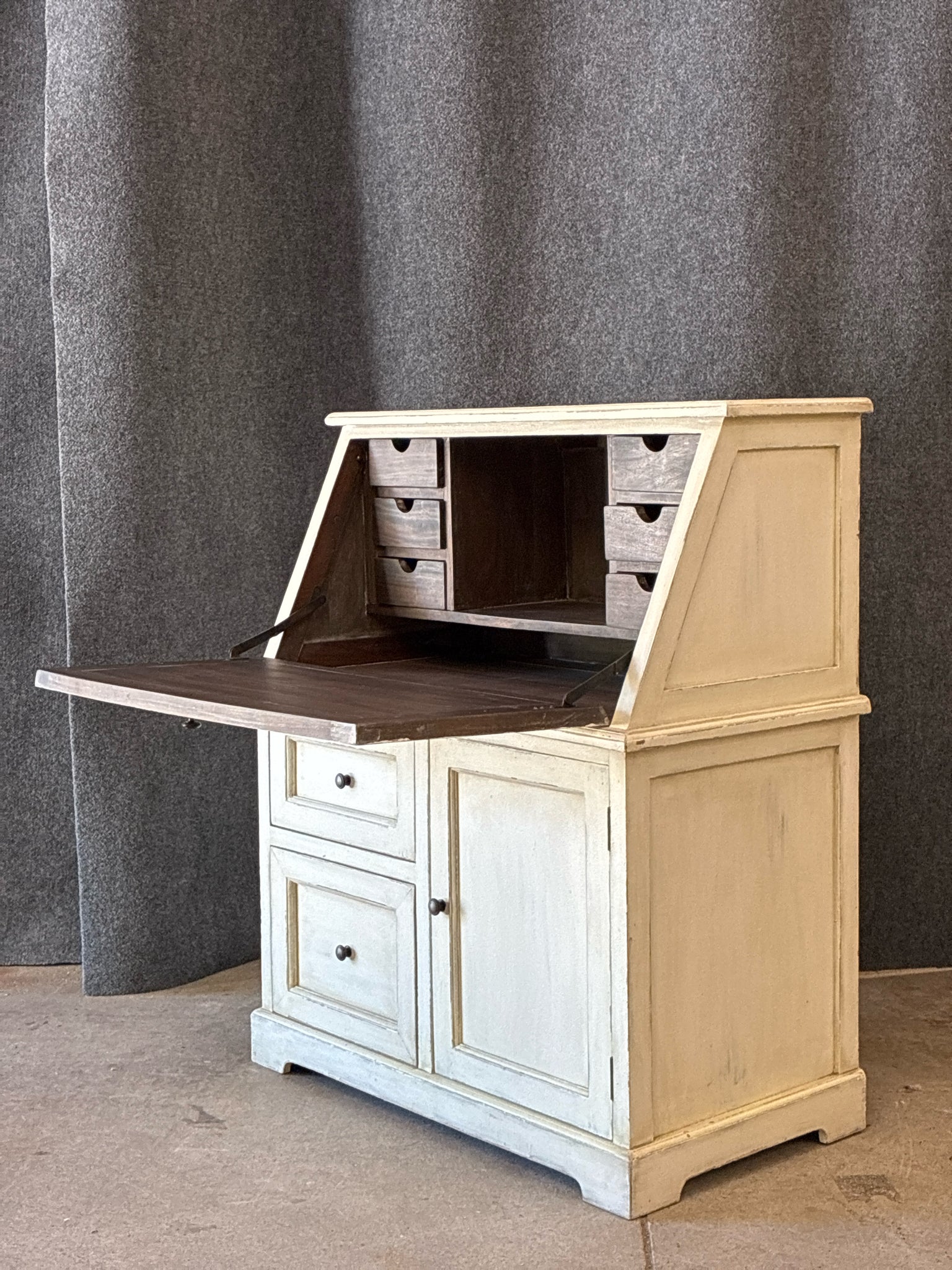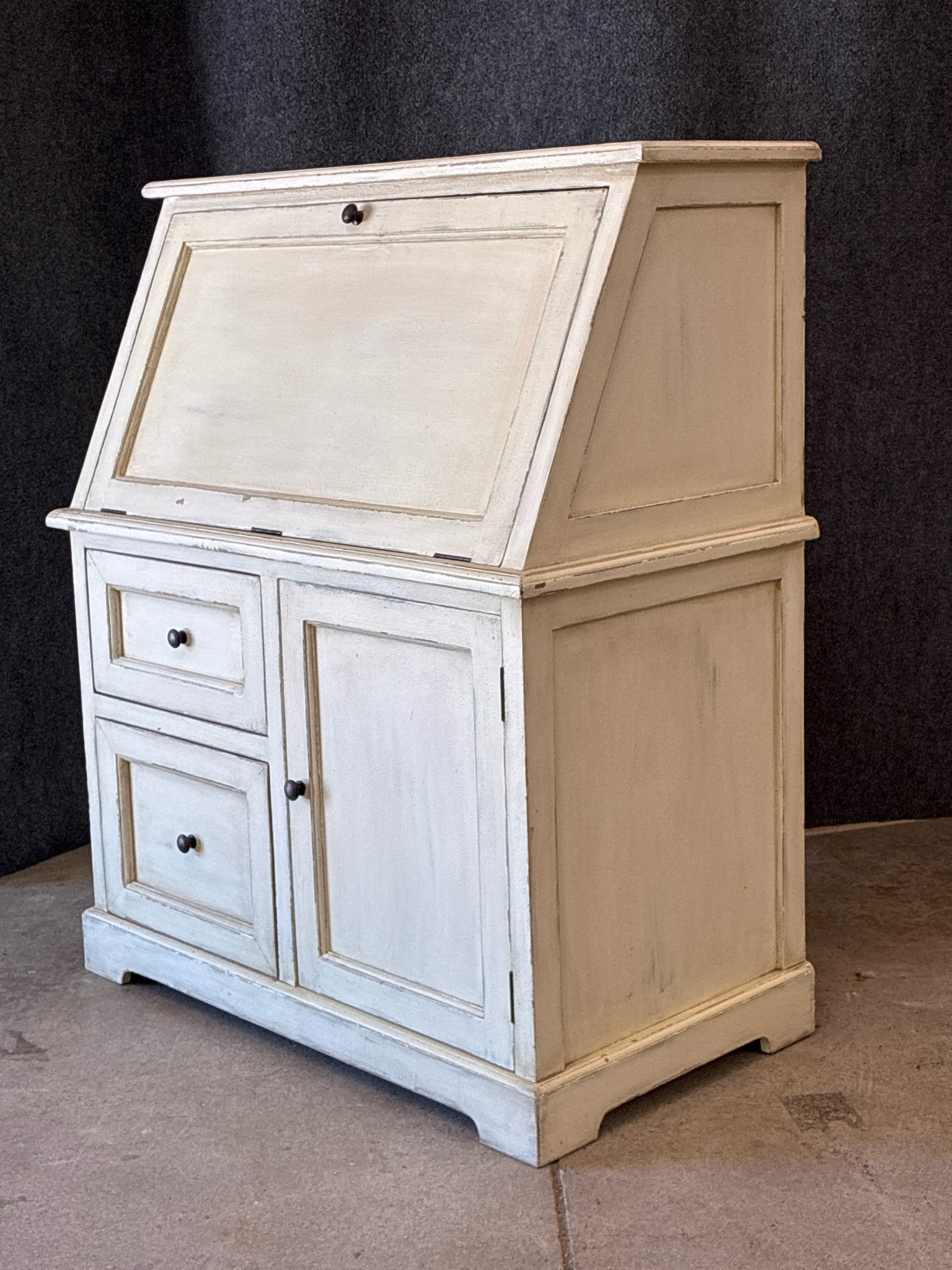 Cream Distressed Drop-Front Secretary Desk. Dimensions: 39.5" Width, 22" Depth, 47.5" Height