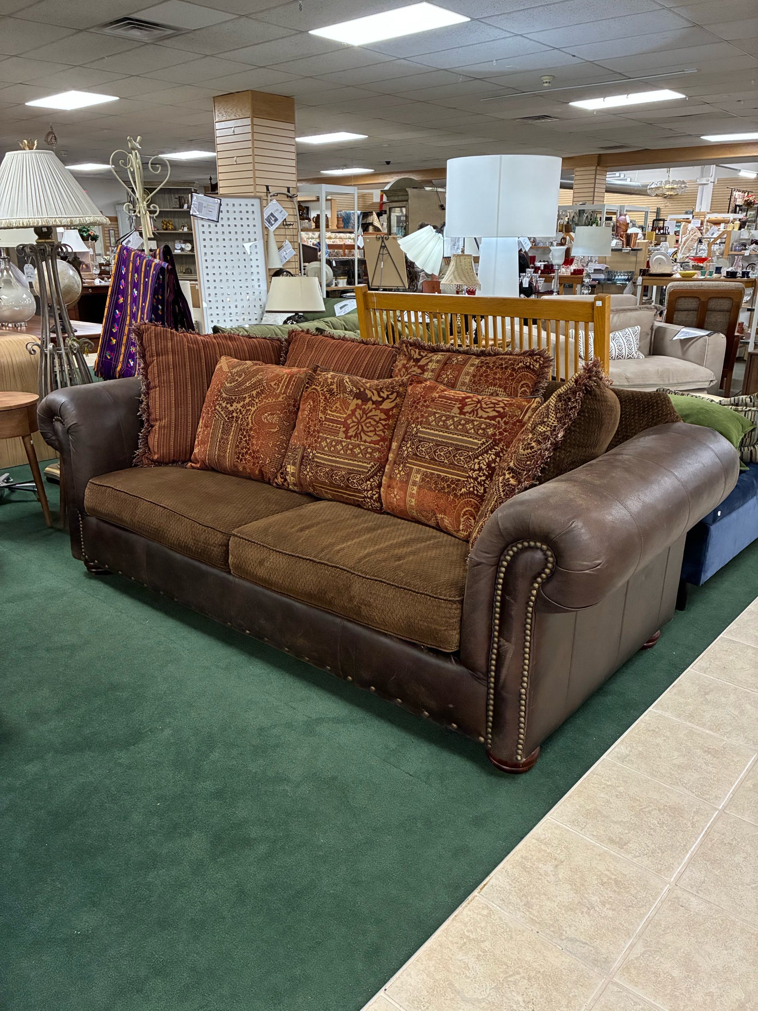 94" Upholstered Sleeper Sofa with Rolled Arms & Tapestry Pillows. Dimensions: 94"W 42"D 33"H