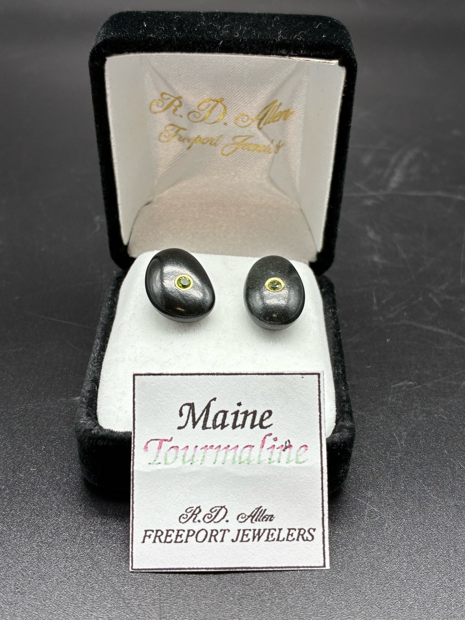 Terry Bradshaw (Maine artisan) black Maine brimstone cabochon stone earrings with bezel set green stones, orig. purchased at RD Allen Freeport Jewelers