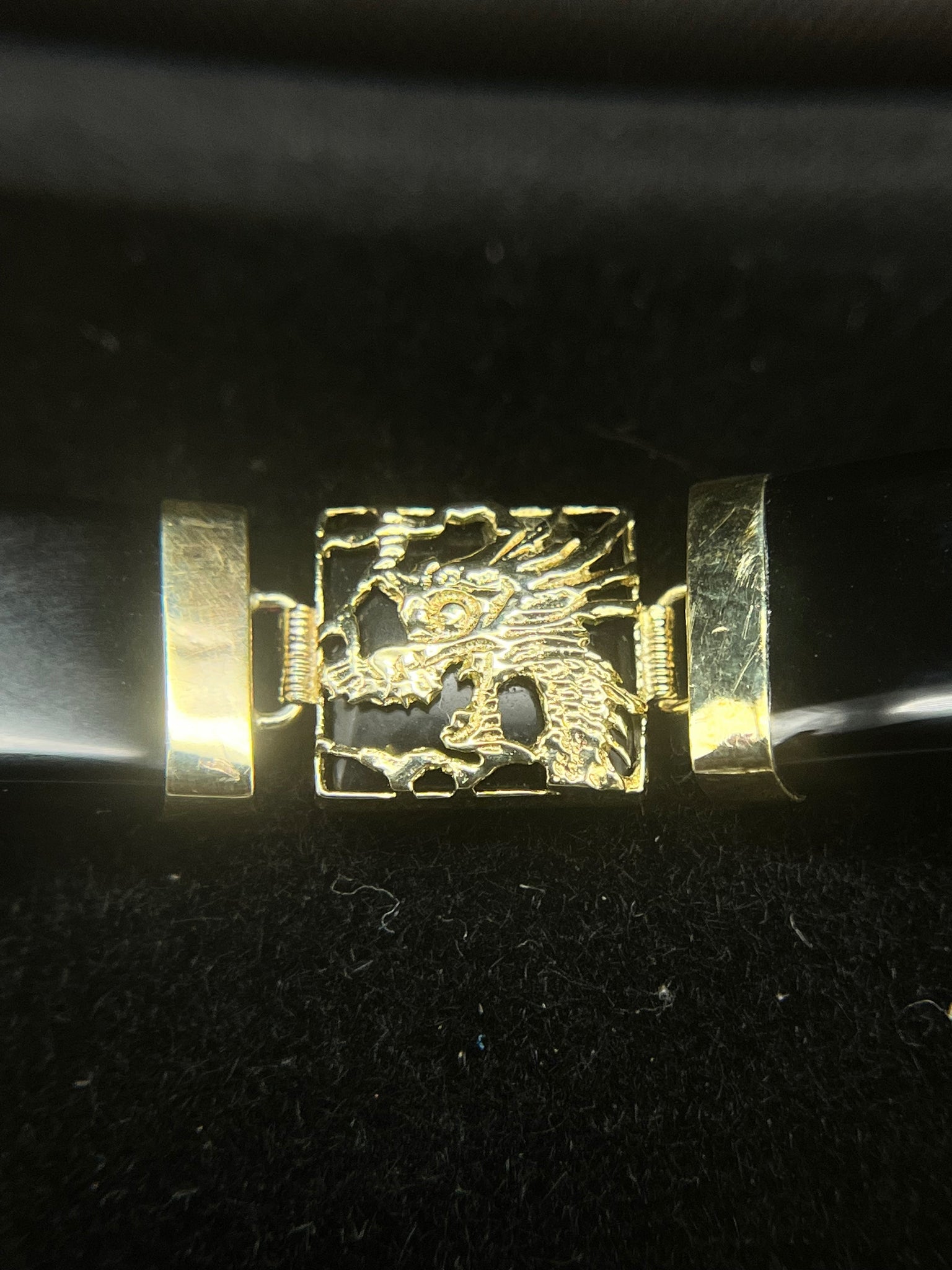 14K gold 7" Chinese dragon onyx bar link bracelet, 17 g