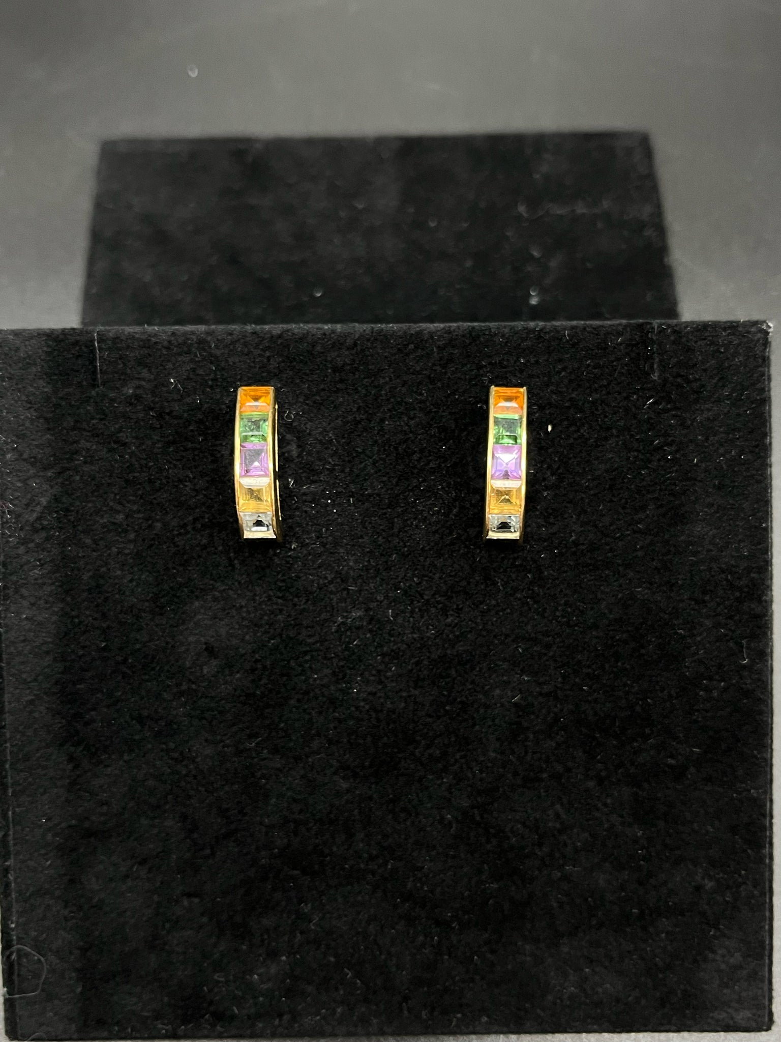14K yellow gold multi-gemstone gold tone half hoop earrings (note: not marked 14k but confirmed via acid test)