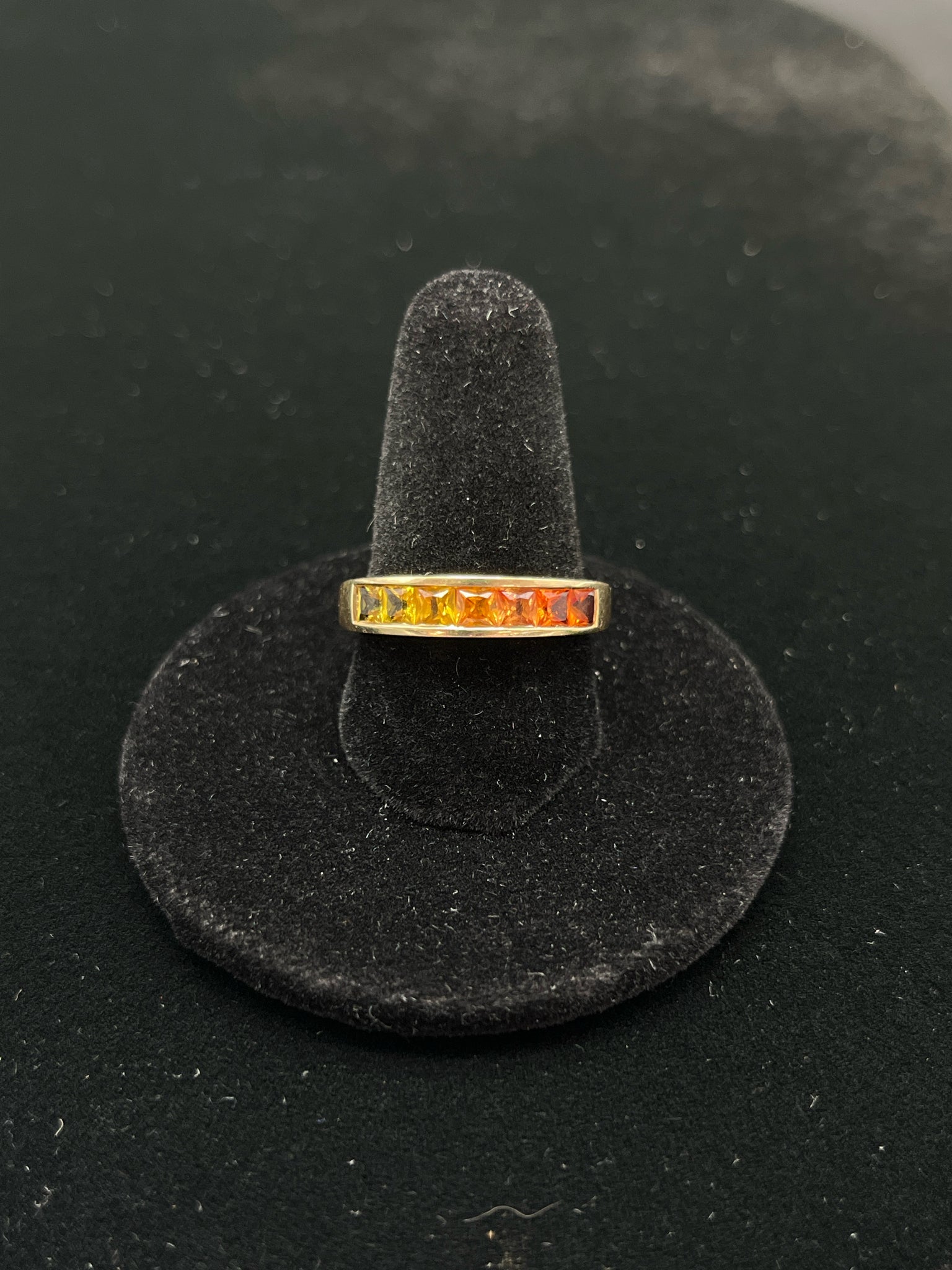 Richard Klein 10K yellow gold channel set ombre yellow to orange stones, size 6.75, marked 10K KL JCI
