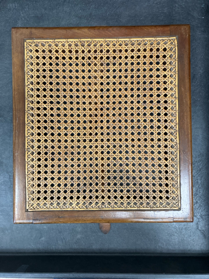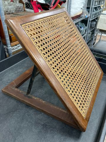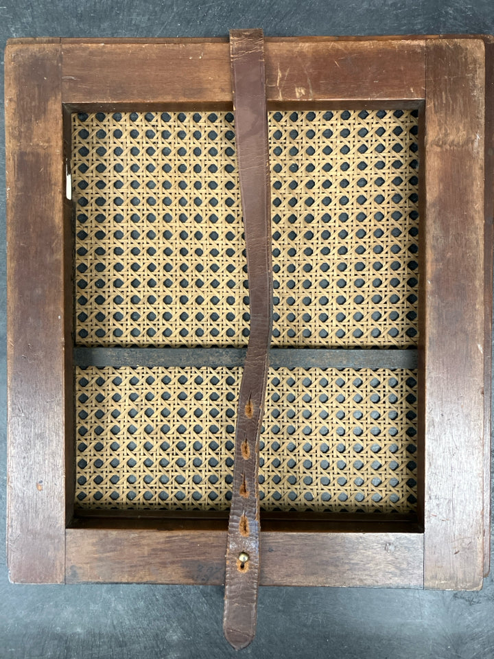 Antique folding cane lounge back rest w/leather strap 17x15.5"