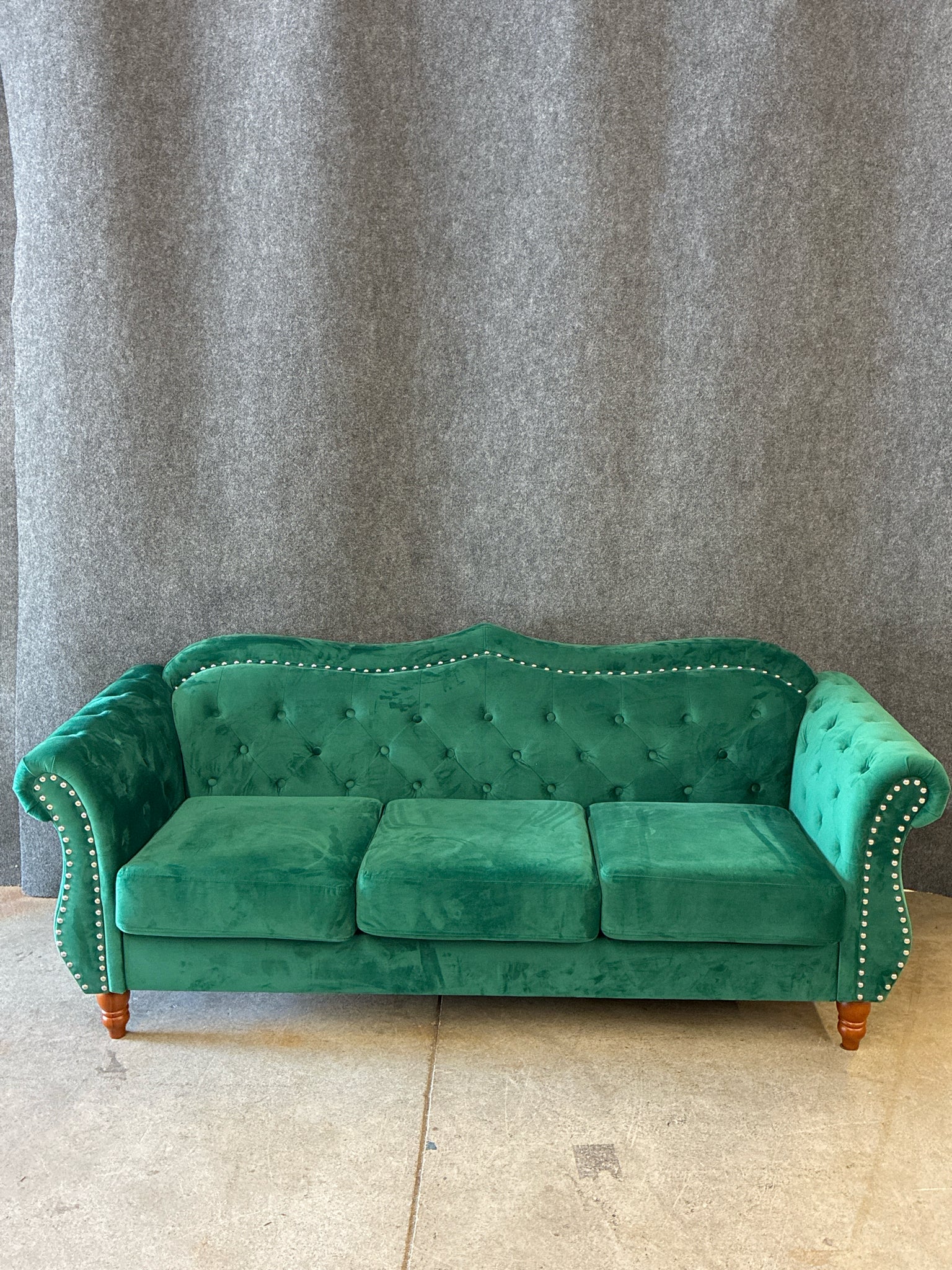 US Pride Tufted Green Velvet Sofa with Nailhead Trim. Dimensions: 80"W 32"D 33"H